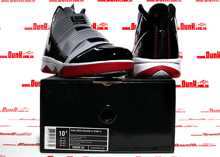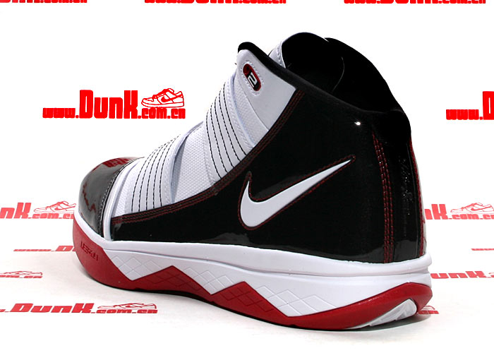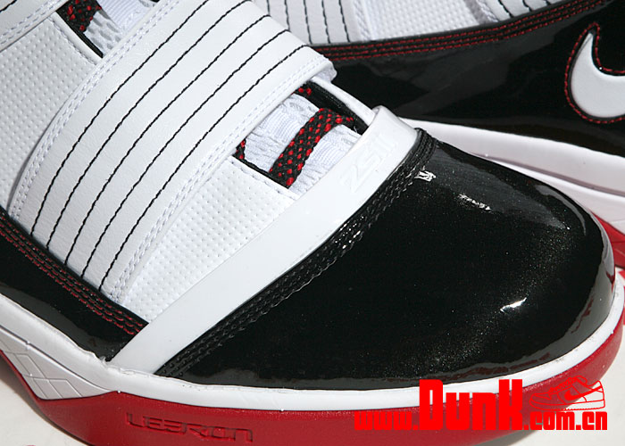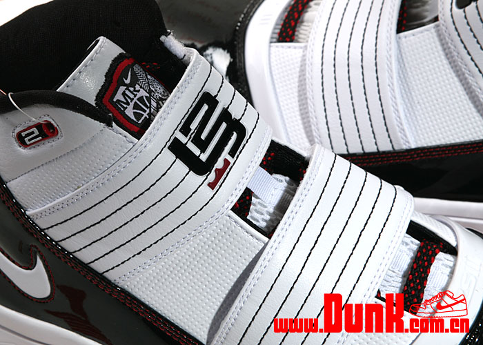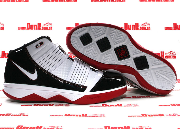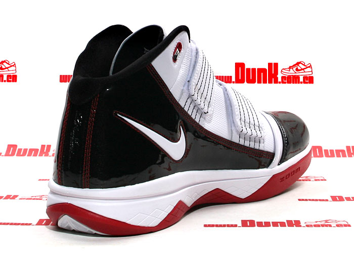 With the Cleveland Cavaliers well on their way to the strongest regular season finish in the franchise’s history, it’s only fitting that their main attraction should get a nice new shoe to show off in the playoffs. Last month, we showed you some images of a similar colorway for LeBron’s Zoom Soldier III, but these new ones are a little different, flipping the placement of certain white and black sections of the shoe. This version still uses a black/white/red color scheme, but on these, the toe cap is black patent leather and the straps and section of the upper beneath them is now white. Also, a red and white midsole gives the shoe a nice shot of color to spice up the basic black and white upper. Look for these to begin hitting Nike retailers in time for this year’s NBA Playoffs. Stay tuned for the official release details. via dunk.com