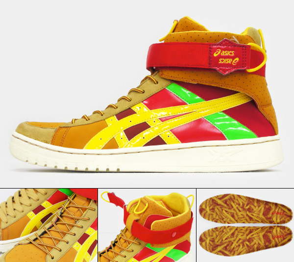 Most sneakerheads are probably familiar with Olle Hemmendorff’s rendition of the Nike Air Max 90 as a hamburger. Even if you didn’t know the artist’s name, it’s an image that’s likely to stick with you. This collaborative effort between Japanese retailer GETTRY and Chinese powerhouse Asics takes the idea to a new level. The GETTRY x Asics Procourt AR ‘Hamburger’ edition stands out as one of the more outrageous sneaker designs in recent memory. They feature a tonal brown base to symbolize the bun and french fries, while colourful strips evoke various condiments. Inside you’ll find a photo-realistic french fry insole, while Timberland-like corded laces tie the whole thing together. Hungry? Why wait — cop these now from GETTRY.