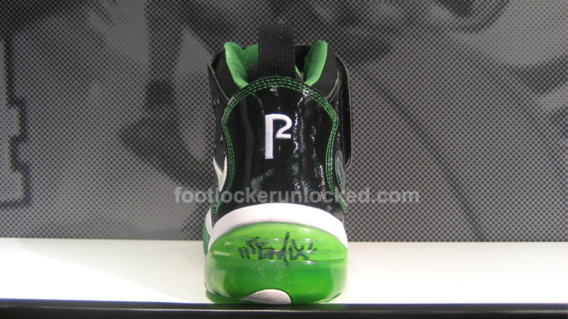 His Boston Celtics seem to have a thing for playing alot of games in May and June, so it’s only fitting that we’re seeing a new Paul Pierce PE for their away games. The Nike Zoom Sharkley Paul Pierce PE away edition features black patent leather where the home version was white. These are equipped with a white upper midsole, since the black outsole has been swapped for green. As with the other joints, these are available at Foot Locker in Beantown at 779 Dudley St. and 375 Washington St., plus their House of Hoops specialty stores. Pairs are already trickling into the various HoHs and should release at both of the aforementioned Boston locations Friday.