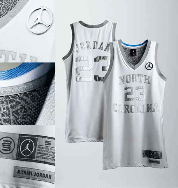 The celebration of the 25th Anniversary of Jordan Brand will kick off this weekend, as the Air Jordan 1 25th Anniversary is set to release along with the Air Jordan 2010. In addition to the release of the shoes is a small selection of Silver Anniversary apparel and accessories – the Jordan UNC Jersey and a Silver Anniversary Duffle Bag. Both items are given the Silver treamtment; the UNC jersey is white with a silver trim with the famous Elephant print on the inside, while the Duffle, a collaboration between Jordan Brand and Cole Haan, features premium leather with matte silver hardware. Both the jersey and bag are very limited, with just 500 of each made. These are available today at MAJOR.