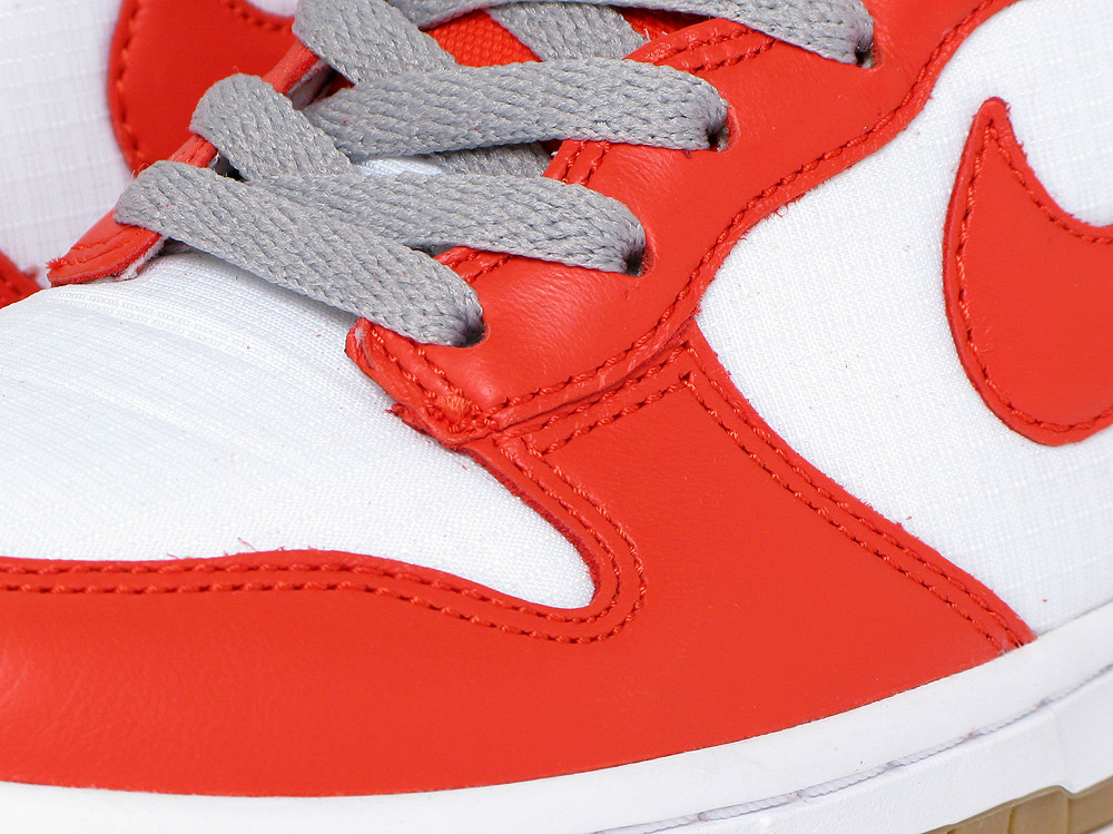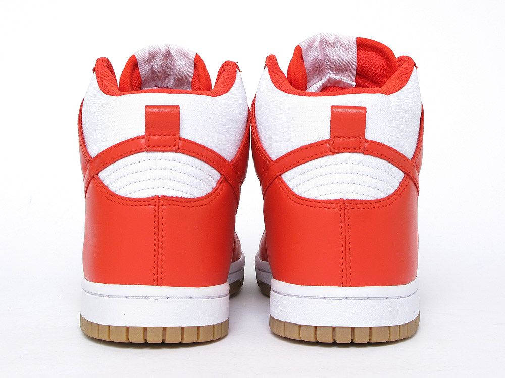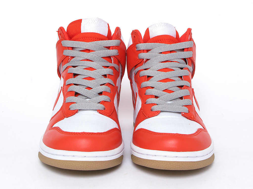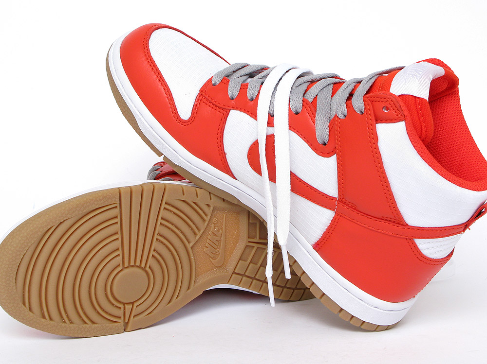 From SB to the ‘standard’ Swoosh kicks, we’ve seen a bunch of Nike Dunks with very basic colorblocking schemes this year. Among that crowd, there was another Nike Dunk High in orange and white like these joints, but to say the new WMNS pair pictured above is an afterthought, would be a mistake on your part. Take a closer look and appreciate how the rarely seen smooth leather and ripstop nylon looks on this pair. It gives the white parts a nice shine at certain angles and ensures they’ll look nice with either matte silver or white laces. Continuing proof that women’s sneakers are becoming a priority for designers, these just touched down at SneakersNStuff.