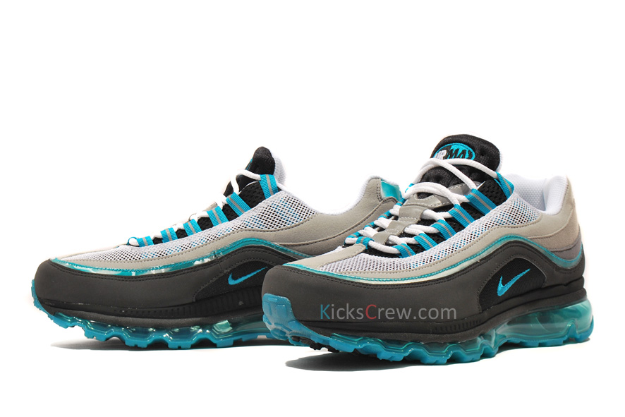 Earlier this year, lady sneakerheads made the guys jealous with a hot Nike Air Max 97 done up with OG Silver Bullet-style colorblocking and a clean white/Glass Blue palette. Around that same time, a ladies Air Max 24/7 hit sporting that same shade to accent the Air Max 95’s ‘reverse’ grey-dient. Not exactly a replacement, these new AM24-7s in men’s sizes add Glass Blue to the Cool-Neutral-Medium Grey AM95 motif for one of the most pleasant surprises from the 24/7 so far. And you’ll be pleased to find that the blue sections on this pair’s upper are composed of a special iridescent patent leather that gives these a look unlike any 24-7 yet. These’ll hit US Nike Sportswear retailers soon, but you can already grab yours today from Kicks-Crew.