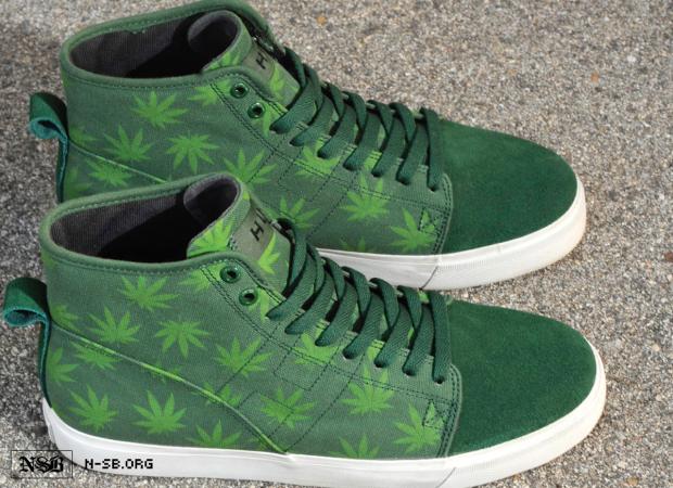 California-based skate clothing and sneakers brand HUF has collaborated with Nike on several occasions, but with Todd Bratrud reprising his role as the designer of this year’s 4/20 Dunk SB, Keith Hufnagel and crew had to look within for a festive theme. And just one look at the HUF Hupper ‘420’ gives you all you need to know about this model’s theme, its tonal green design switching from suede on the toe to an all-over printed canvas everywhere else in celebration of Cali’s favorite unofficial holiday. Coming along with the obvious design is a trio of similarly patterned socks, so all you need now is an outfit from Hickey Freeman’s S/S ’09 collection to finish the look. Click through for more, let us know how these compare to the ‘Cheech and Chong’ SB Dunk High and stick with Sneaker News for updates on these April releases. via NSB