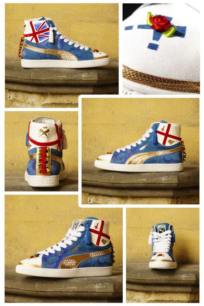 With British Royal Wedding spoofs winning the meme du jour award, we’re somewhat surprised there haven’t been more sneaker tie-ins with Prince William’s nuptials. It was somewhat natural to see New Balance, who keeps factories running in the UK, to offer their own salute to the gala event, but this new Puma Suede Mid Royal Wedding custom collection is a bit less expected. London-based WeAreHQ had six different street artists customize seven pairs of the royal blue midtop Suede silhouette with results ranging from a wacky riding boot design to more obvious nods like a veiled getup. Click on the jump below to see the entire set and let us know which one’s best.
