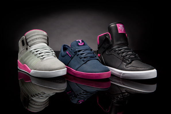 Supra definitely crossed over this summer when they started releasing pretty much everything from their catalog in three-shoe color and theme-united packs of sneakers, but here’s visual evidence of the crown brand going pop. The Supra Pop Pack is named for its use of a vibrant pink accent shade on the soles of the Supra Skytop III and Stacks lowtop, plus the lining and details of the Vaider Mid. You get a different take on each pair thanks to the differing vamps and grey, navy and black uppers, respectively, and images of each pair are waiting after the jump. Is Supra enjoying their finest hour or should they seek a new release strategy? It’s an easier decision to make with more images to inspect, so let us know what you think and look for yours at select Supra stockists.