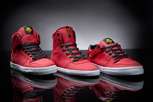 Miami’s professional basketball team hasn’t been united since early in the 2011 NBA Finals, so Supra’s looking to fill in the gap with a little Heat of their own this winter. Supra’s Hot Pack adds the kind of black and yellow trim to a trio of red uppers you might expect from a Nike LeBron PE, but all three of these are skate silhouettes with major casual appeal. The Supra Vaider Mid, Cuttler and Vaider Low are each cast in an aggressive shade of canvas and has us wondering how long the crown brand can wait before we see something similar, but with green hits for Christmas. Check out the Hot Pack’s ‘Big Three’ after the jump and then look for them at Supra dealers worldwide.