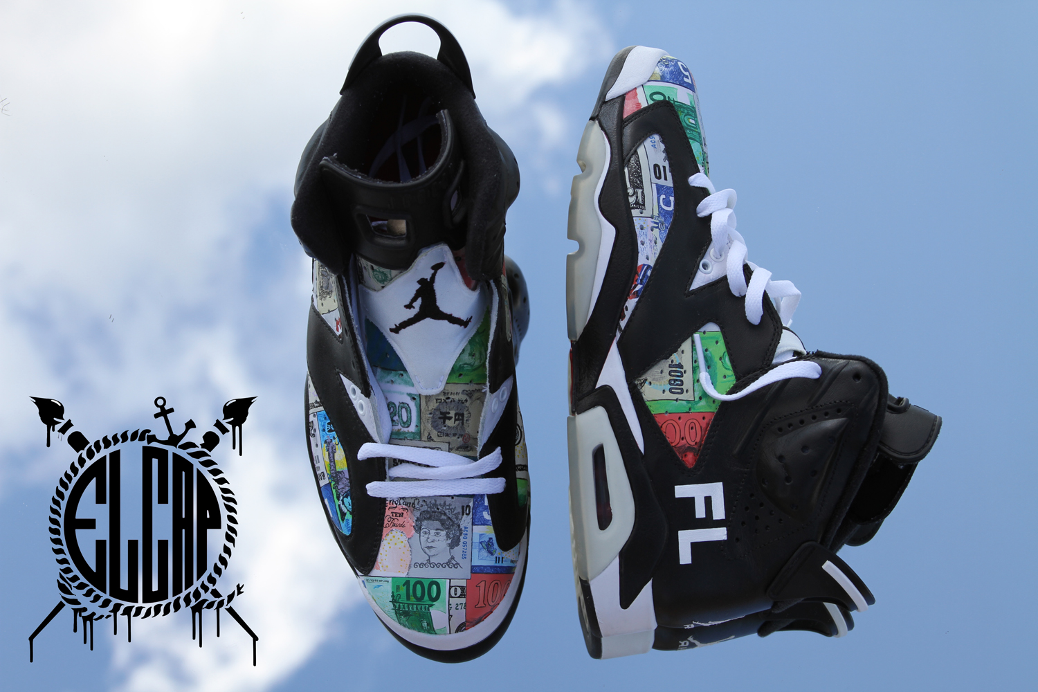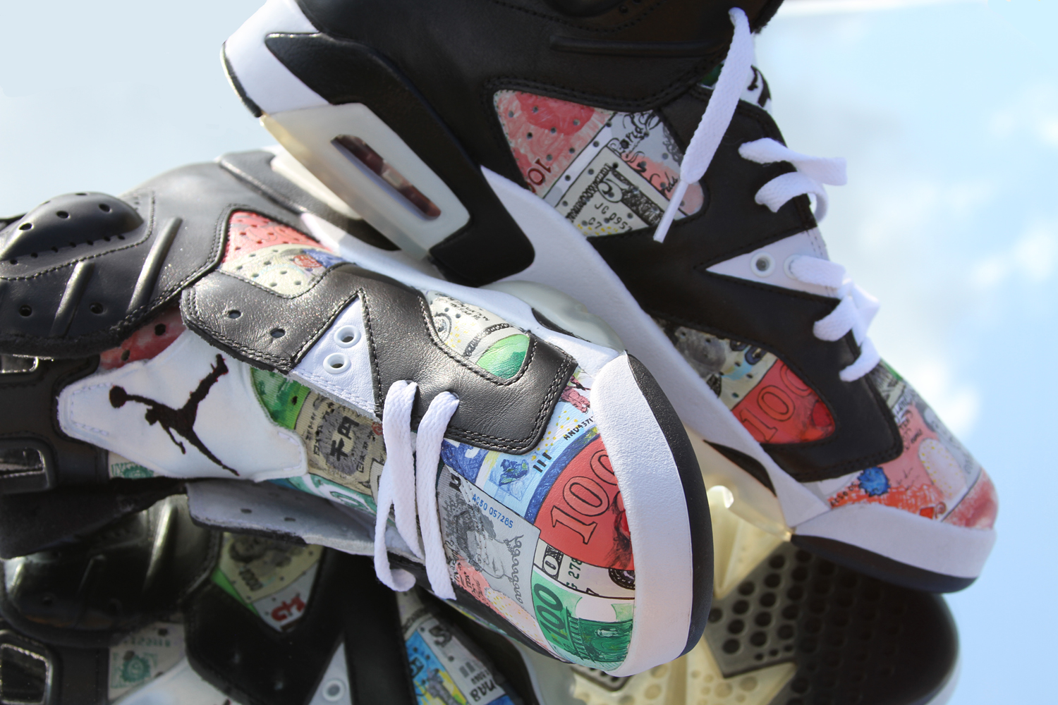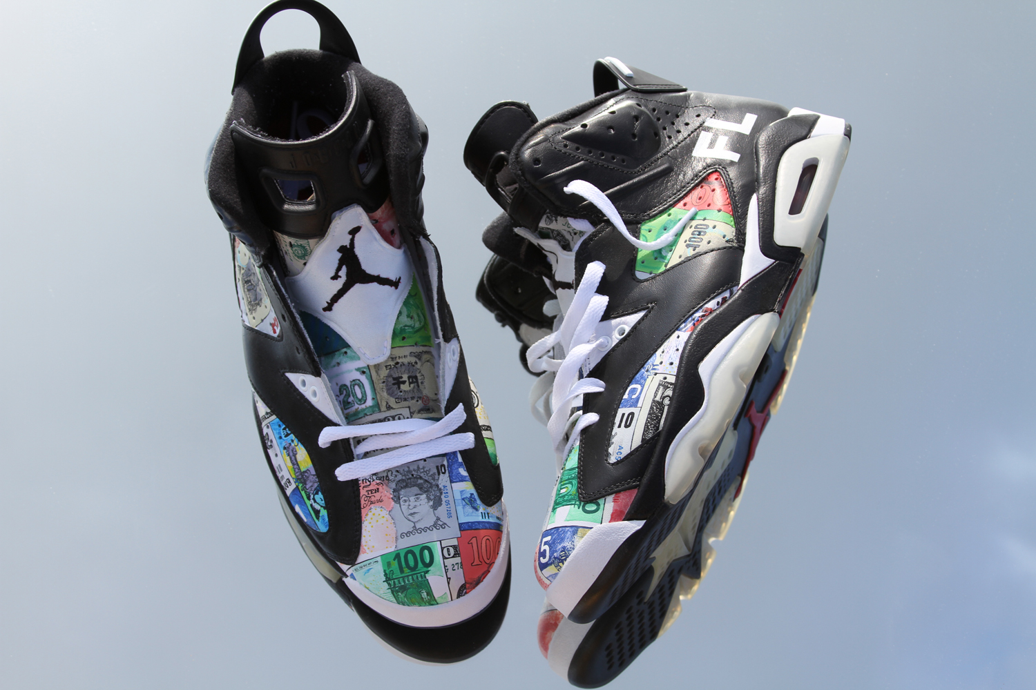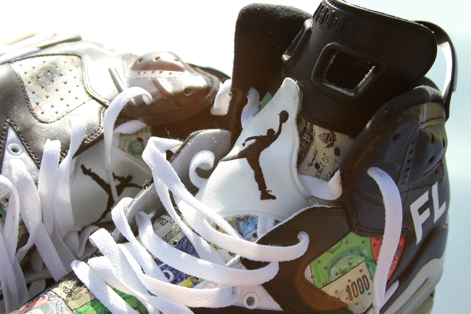 El Cappy is back to work on Air Jordan’s, taking the logical step up timeline wise from his recent Air Jordan V to get down with the Air Jordan VI. On this piece of work he ports over one of the more prized Nike Dunk’s out there, Futura’s Nike SB Dunk High ‘FLOM’. Of course that silhouette has seen an official remix by the Swoosh team, later touching down on the standard Nike Dunk High silhouette as part of the Livestrong collection, but seeing the allover money print on the Air Jordan VI like this is certainly a first. Hit the jump with us to see the up close shots of Cappy’s crazy handiwork and let us know what you think of the Air Jordan VI ‘FLOM’ in the comments below.
