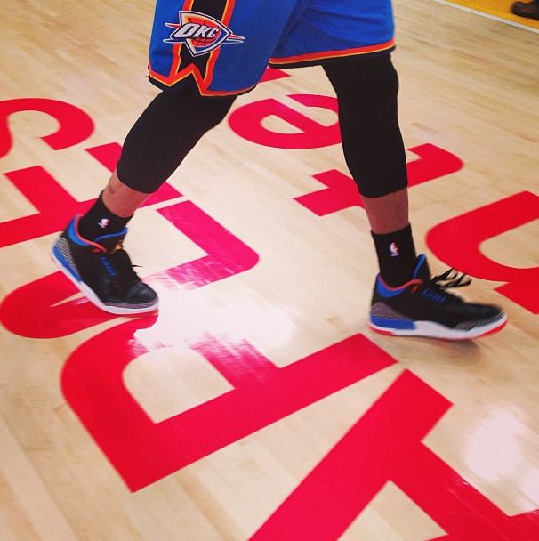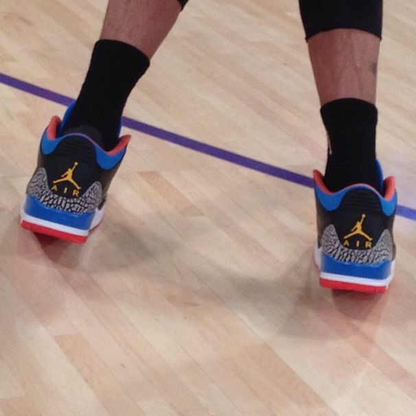 Russell Westbrook’s Jordan Brand perks continue to get sweeter with the Air Jordan III ‘Thunder’ pair pictured here. Westbrook is currently wearing the sneakers on-court against Oklahoma City’s away game against the Lakers. The base is a relatively familiar looking ‘Black/Cement’ with plenty of orange and blue sprinkled in between the sole, lining, and accents. Continue reading to check out this first look at the Air Jordan III PE for Russell Westbrook and check back on Sneaker News for more later on.