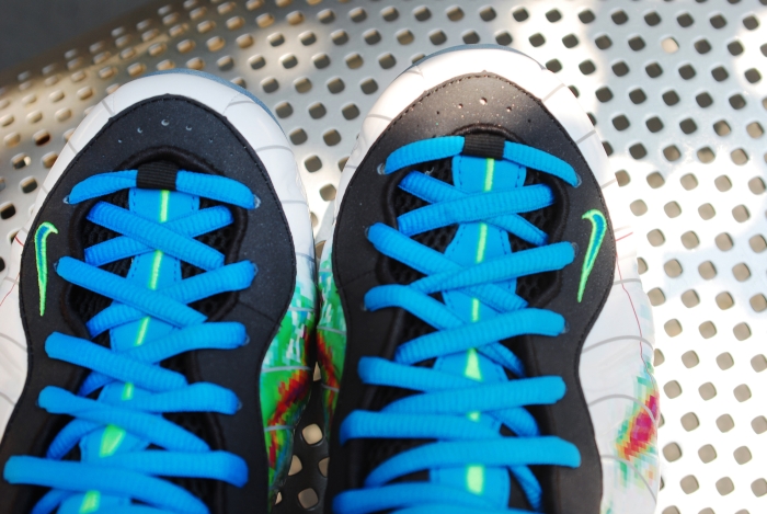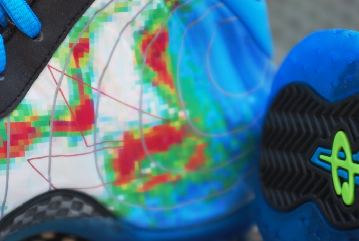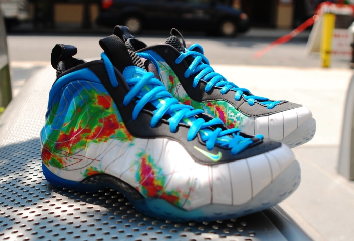 The Nike Air Foamposite One “Weatherman” will release tomorrow, August 30th. The sneaker is certainly one of the most boundary pushing of Foamposites so far in terms of the colorway used, which is a doppler radar style scramble of current blue and flash lime. The sneakers take some notes from previous premium pairs like the “ParaNorman” and the “Camo” and slap on an extra logo for the pull tabs on back. Stay with us after the click for a refresher on the pair and keep in mind that they’ll be popping up tomorrow, along with the corresponding Nike Air Force 1 CMFT, at retailers including DTLR.
