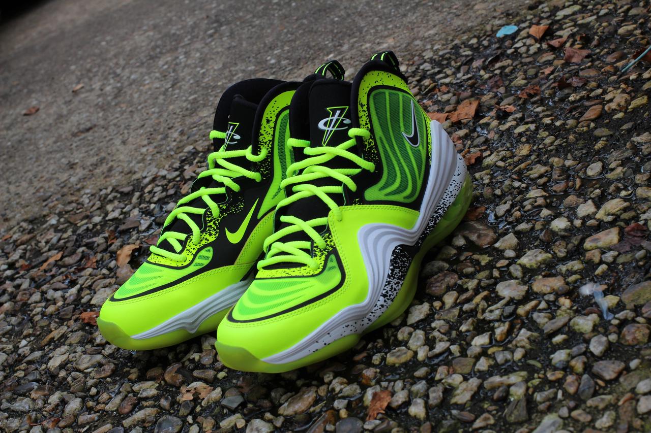Is the newest Nike Air Penny V the model’s most eye-catching colorway to date? Earlier releases like the ‘Invisibility Cloak’ and ‘Phoenix Suns’ stand out from the pack, and the Total Crimson and ‘Red Eagle’ makeups are burning hot, but this one covered in the familiar Volt neon tones is a true neck-breaker. Add in the almost Agassi-like splatter print and they take on a tennis ball appeal; will you be picking up one of the ‘Highlighter’ Air Penny Vs when Nike Sportswear serves them up next Saturday at locations like Rock City Kicks?
