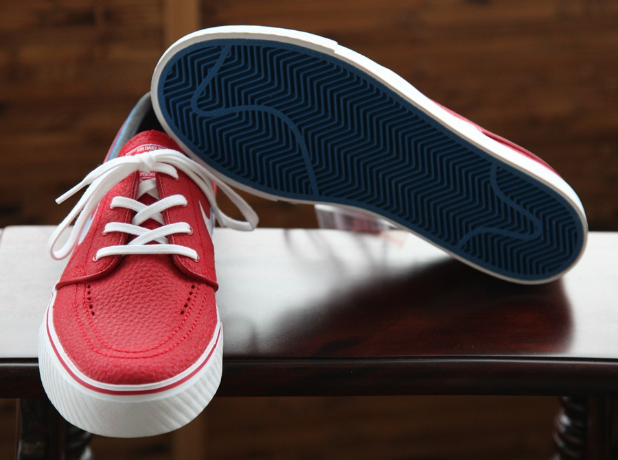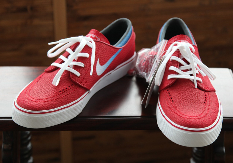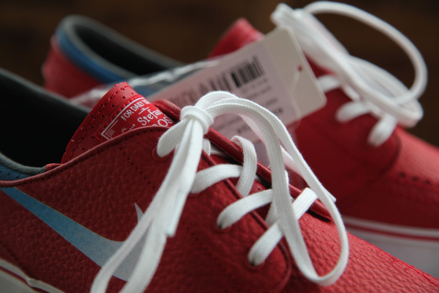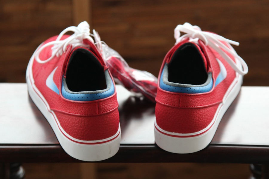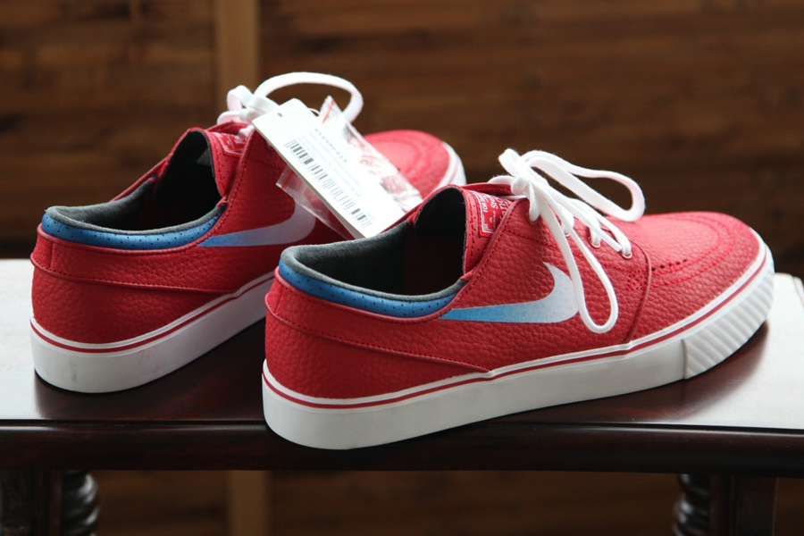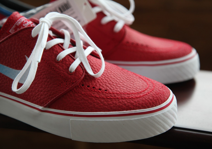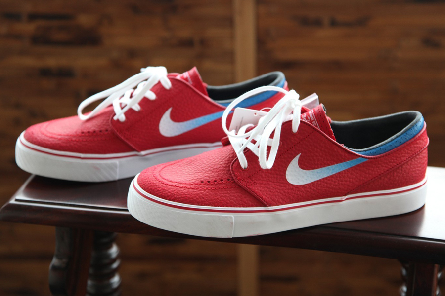 The Nike Zoom Stefan Janoski has released in a handful of leather colorways over the years, these drops deviating from the suede or canvas that typically dominates this model. It looks like we might have a bunch more coming up soon, because Nike SB is also beginning to designate these releases with an ‘L’ suffix on the labels. This particular Janoski L uses a rich tumbled red upper as accented by another unprecedented element in the gradient Swoosh that fades from white into the blue that marks this pair’s ankle collar. You’ll want to take in this novel arrangement with more photos below, then consider the sample pair available now from madsolar on eBay.