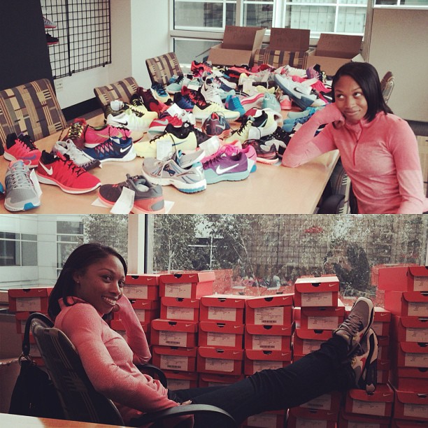 Four-time Olympic gold medalist sprinter Allyson Felix was recently at the Nike campus in Beaverton, Oregon. The lady who made headlines back in 2003 when she gave up her NCAA eligibility to sign with adidas was wearing one of the all-time best-loved Swoosh running shoes in the Nike Air Max 90. Perhaps of more interest was a spread of upcoming runners she posed with inside the Mia Hamm Building, a variety of LunarLon, Flyknit and Flywire equipped offerings that might include the upcoming Nike Flyknit Lunar One V2. Stick with Sneaker News for updates on the popular Flyknit Lunar1+’s sequel and other release info because there looks like something for everyone on that table.