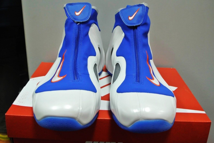 Included in our recent feature of once rare and exclusive sneakers that got wider releases was this colorway that was introduced on the first Flightposite shoe as an Allan Houston PE. The Nike Air Flightposite 2014 is bringing to retail a once unobtainable style, and one that looks downright stunning with the white Foamposite/royal blue shroud and outsole combination. That little bit of orange outlining the Swoosh embroidery reminds us that this style was originally made up to match New York Knicks uniforms. They’ll be made available to sneakerheads in NYC and wherever else NSW retailers are found at a future date to be announced, but if you don’t want to wait for that, a sample pair is available now from ultimatestuff_2012 on eBay.