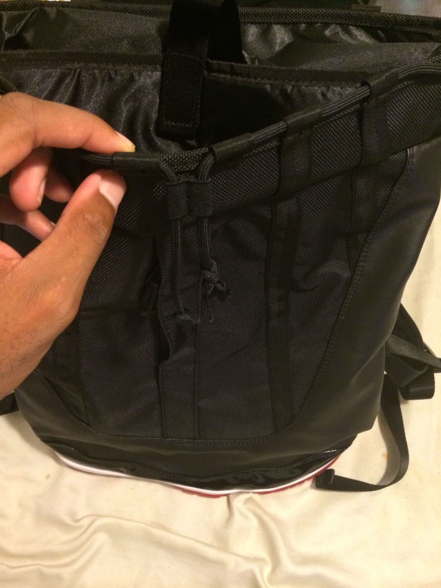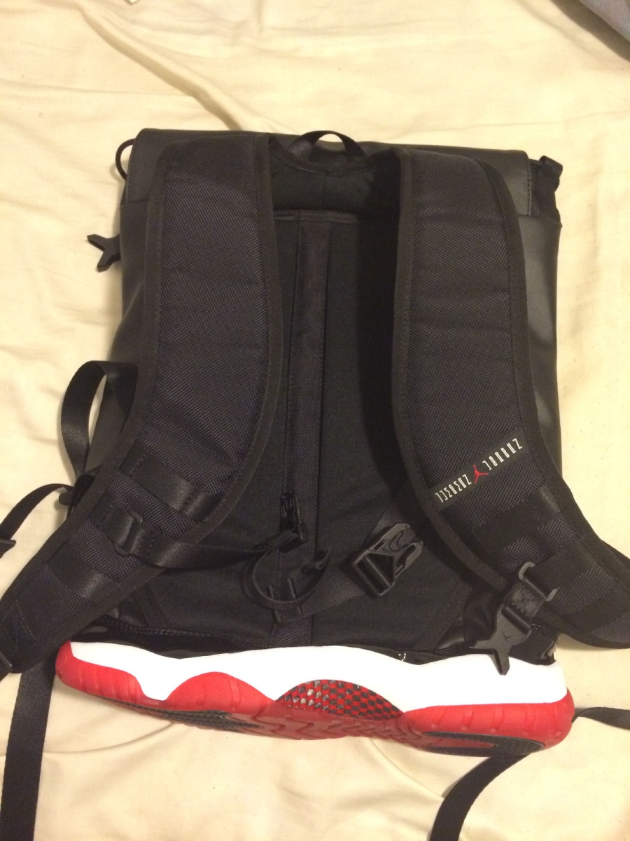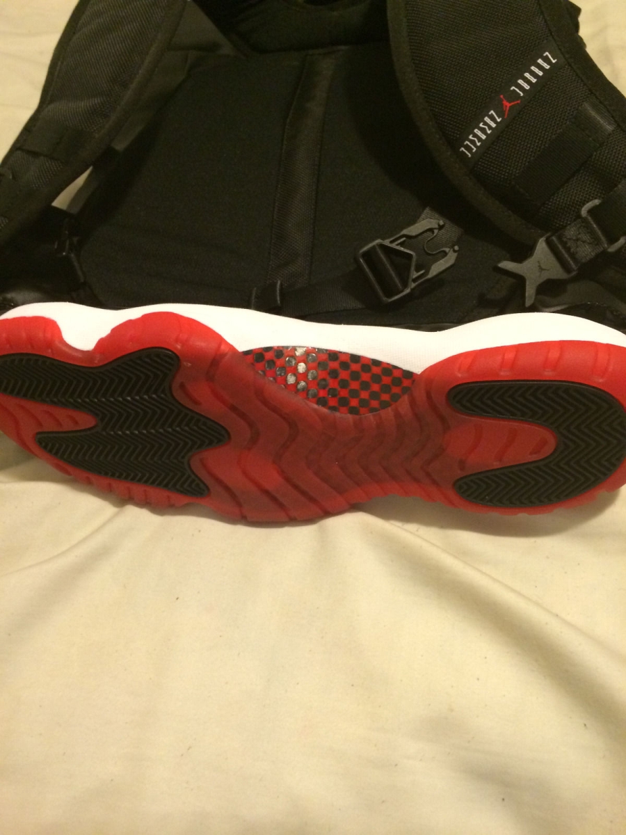 Remember those Air Jordan bags that used to hang around outlets forever? The kind that had actual soles from pairs like the Air Jordan 6 or the Air Jordan 3 utilized for the bottom? Shown here is one of those that we’ve certainly never seen before, an Air Jordan 11 “Bred” bag. Like the other Air Jordan laptop bags before it, the design of the shoe is also evident in the rest of the contstruction. What’s funny about this particular sample bag is that they didn’t get the “Bred” equation quite right – the coloring on the carbon fiber is a little off. Continue reading for more images on this strange piece of Air Jordan history and then bid on the Air Jordan 11 “Bred” bag from goldenarmz4eva on eBay.