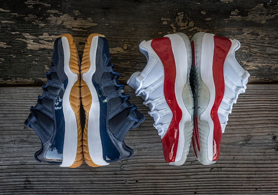 Summer 2016 begins with a bang in the world of Air Jordans, with the drop of two highly anticipated colorways of the Air Jordan 11 Low. Following up the “Flu Game” Air Jordan 12 last weekend, the wallets of collectors get no break this weekend as many will be picking up these two latest drops of the Air Jordan 11 Low, featuring the return of the White/Varsity Red colorway first released in 2001 and the all-new Navy/Gum version. Get one last detailed look at each colorway here to help you decide if you need one, the other, or both, and grab your pairs while they last at select Jordan Brand retailers like Packer Shoes tomorrow.
