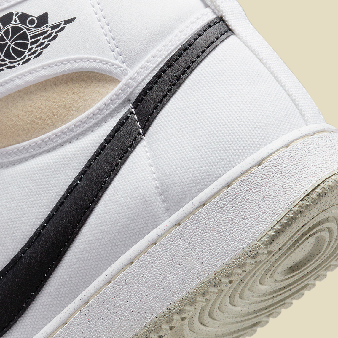 Recently, the canvas-covered proposition appeared in a non-original, grey, white, black and sail colorway. The bulk of the pair’s upper is clad in the two most former of the aforementioned tones, while profile swooshes, “AJKO” branding on the lateral ankle flap and detailing at and around the top of the tongue deviate in stark black contrast. Collar areas and Nike Dunk-reminiscent traction introduce an “aged” look into the mix, which has become popular among sneaker customizers over the last two years. Together, each component helps expand the already expansive design roster of the Air Jordan 1.