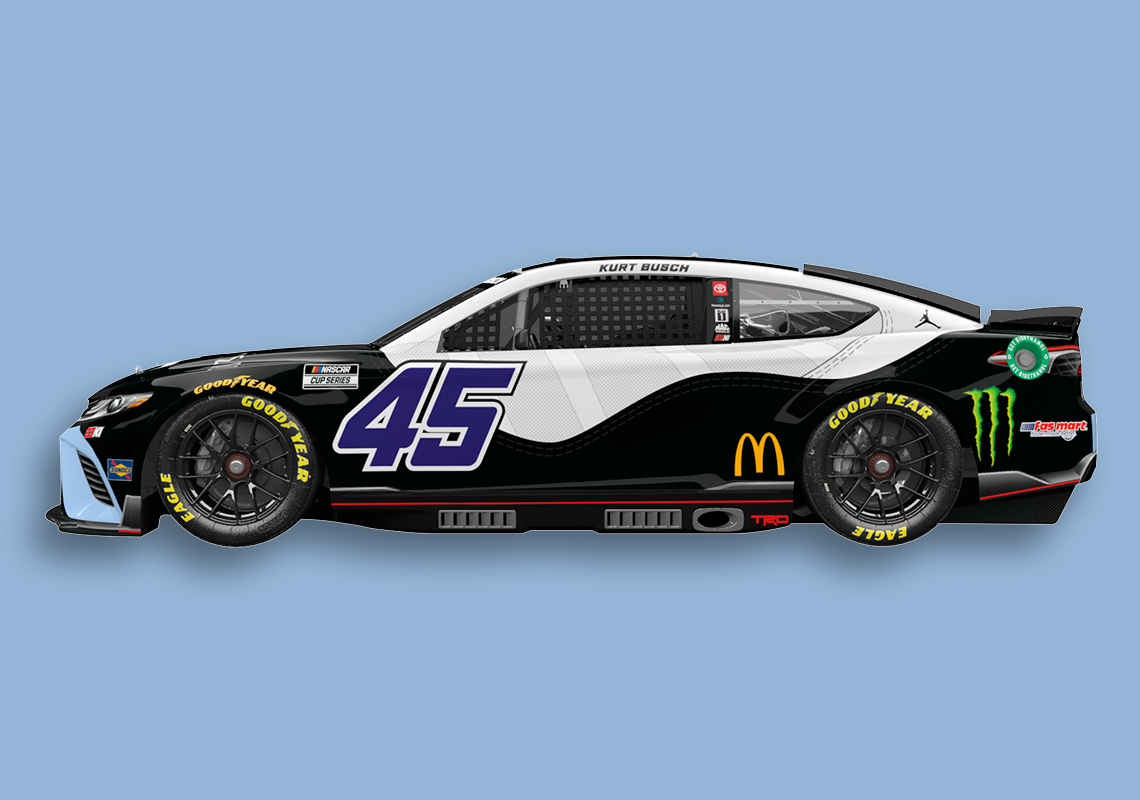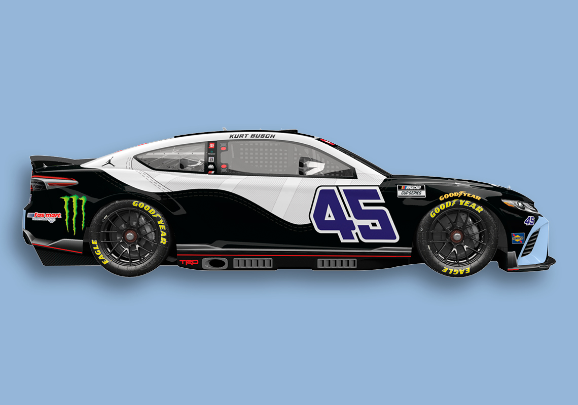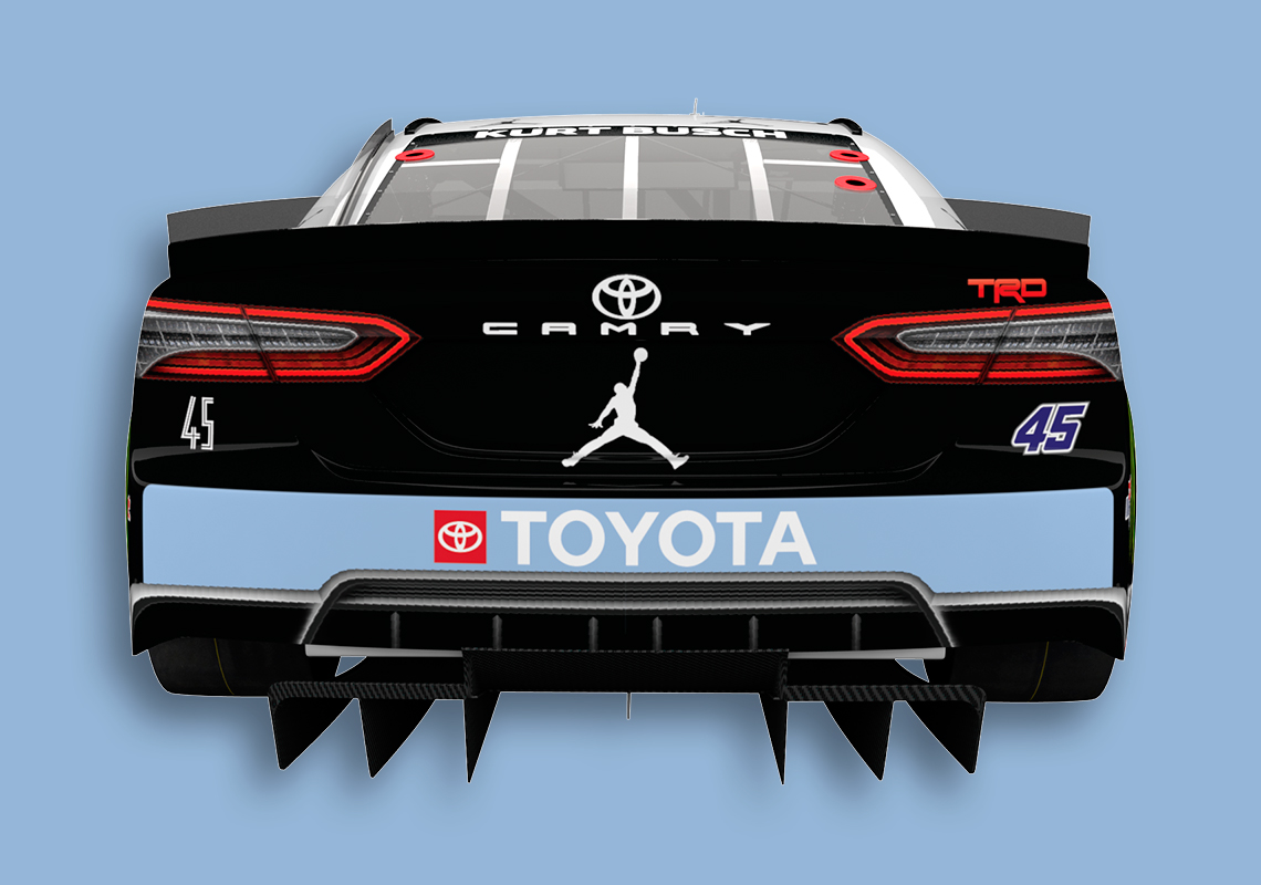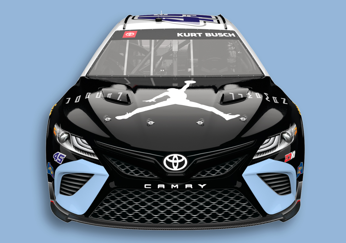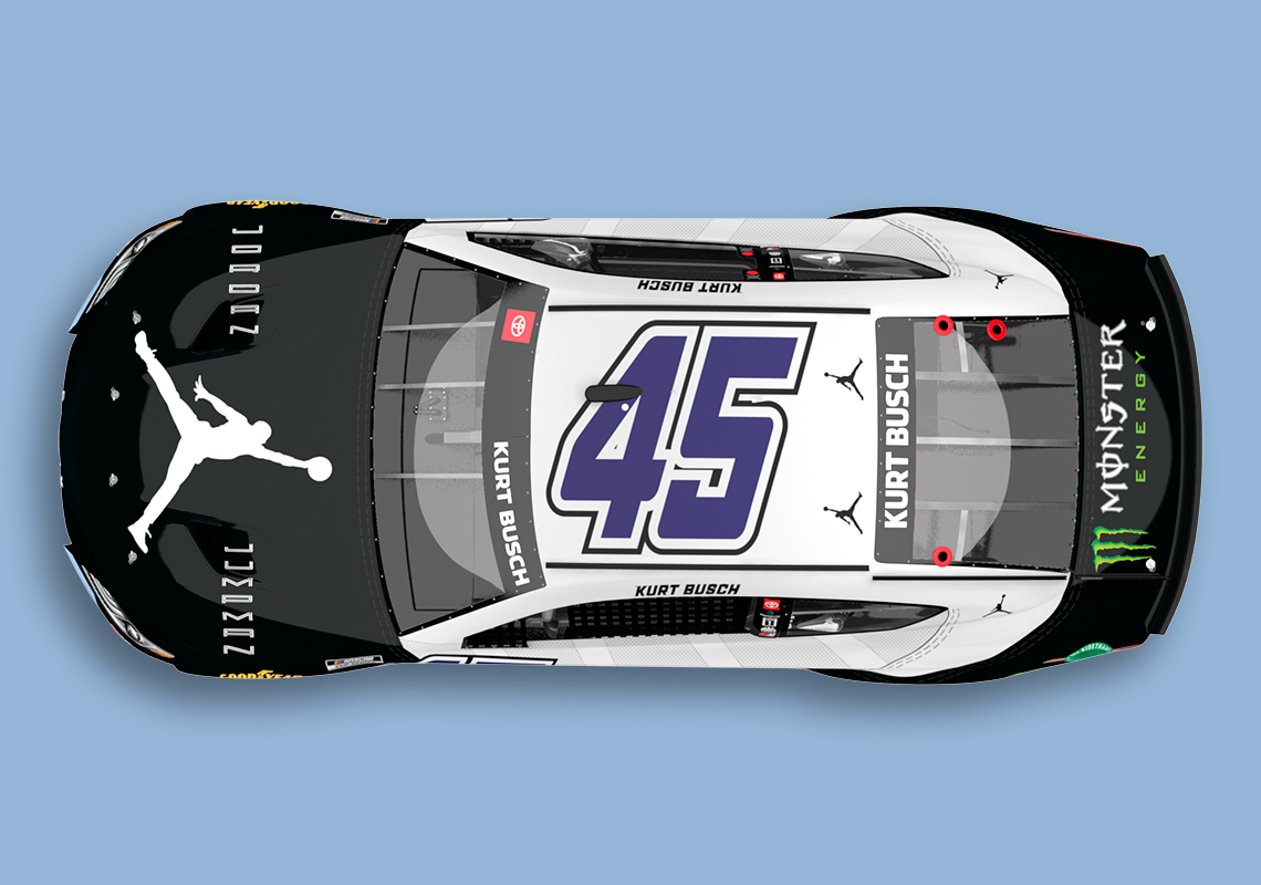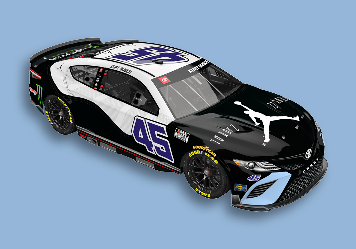 Busch’s last time on the track was in May when he won at the Kansas Speedway. While not discrediting the Las Vegas-native’s driving abilities, it’s important to note that the driver’s Toyota Camry TRD was skinned with an elephant print à la Air Jordan 3 for that race. As a Jordan Brand-endorsed athlete, Kurt Busch has had the privilege of bringing the Jumpman logo to the track, tapping into the heritage of winning of both Michael Jordan and Denny Hamlin, a past Daytona 500 winner and co-owner of 23XI Racing. The latest Air Jordan-inspired update to Busch’s livery makes absolute sense given the vehicle’s number 45, the digits Jordan wore after Game 1 of the 1995 Eastern Conference Semifinals and that appeared on the “Concord” release from 2018. Patent leather mudguards and durable ballistic nylon are “recreated” on the car, with purplish digits landing on the side and top of the car. Lastly, a white-colored Jumpman logo is stamped onto the hood.