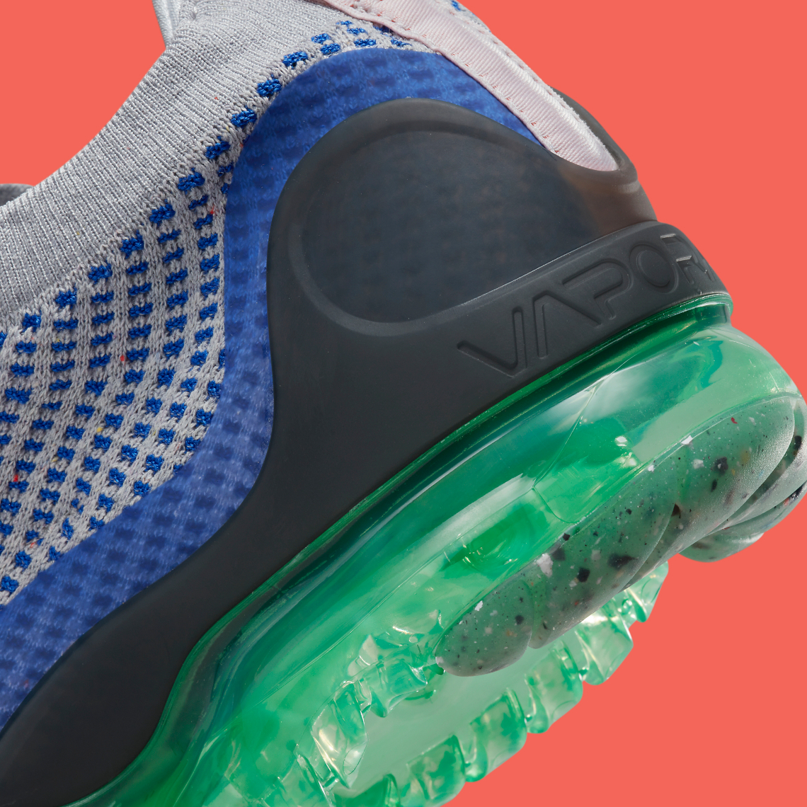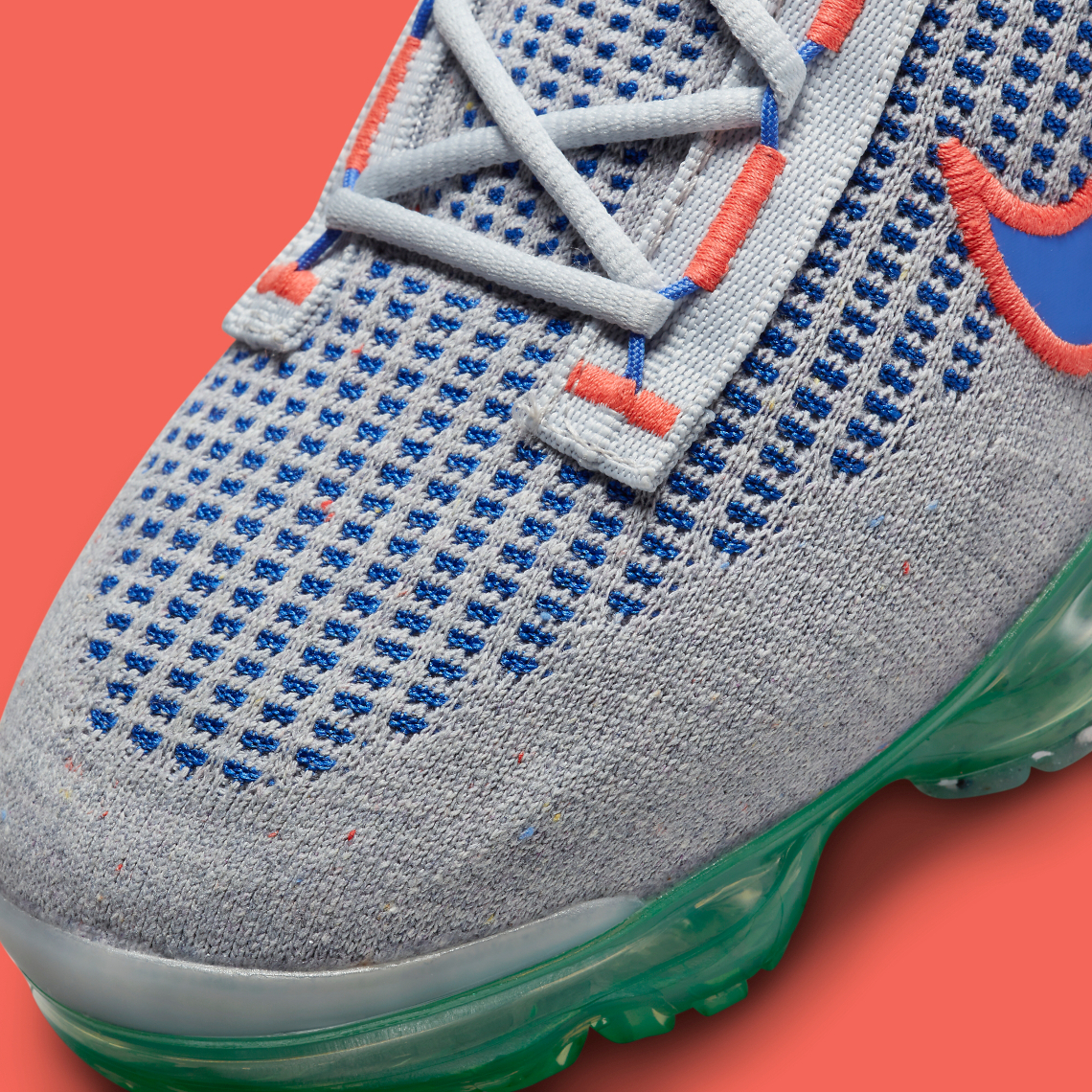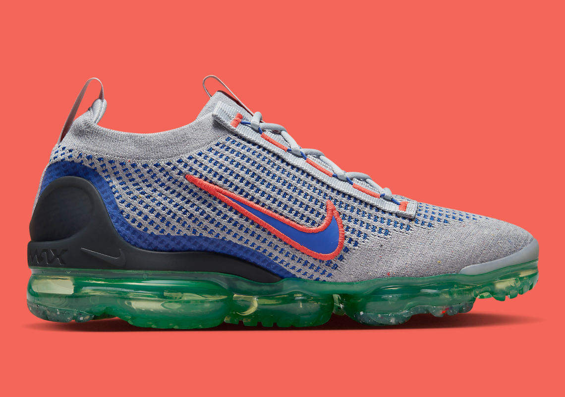 Recently, the Vapormax-cushioned silhouette emerged in yet another greyscale arrangement, only this time, the sneaker is offset by much more vibrant accents. Profile swooshes indulge in a blue and orange color palette reminiscent of the New York Knicks, Islanders and Mets sports teams; components along the tongue and around the heel follow suit. Robust cushioning solutions underfoot opt for a disparate green hue that further keeps the pair from simply being another grey offering.