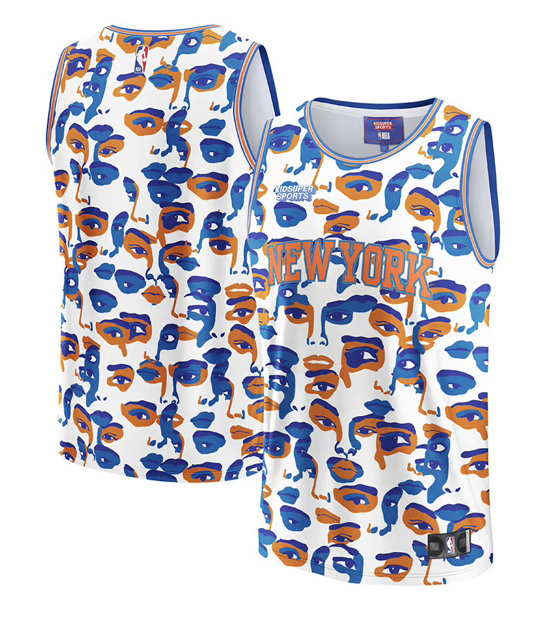 Abstract face prints have been a signature of KidSuper essentially since the brand’s inception. The particular layout that paints the upper of this MB.03 release, however, is one that’s been honed in on in recent years. Basketball fans might remember the collaborative capsule they put out with the NBA where it appeared, underpinning jersey designs for the likes of the 76ers, Spurs and Knicks, pictured below.