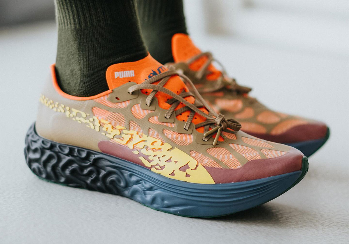 While the chunky midsole and thin upper construction points more to a running supershoe than anything that’d grace the hardwood, the overall shape still resembles the PUMA All-Star Nitro, a shoe that stands at the center of their basketball roster and itself borrows that Nitro tech from their track offerings. There are also similarities to the Deivate Nitro line, especially noticeable at the foot entrance and shape of the tongue.