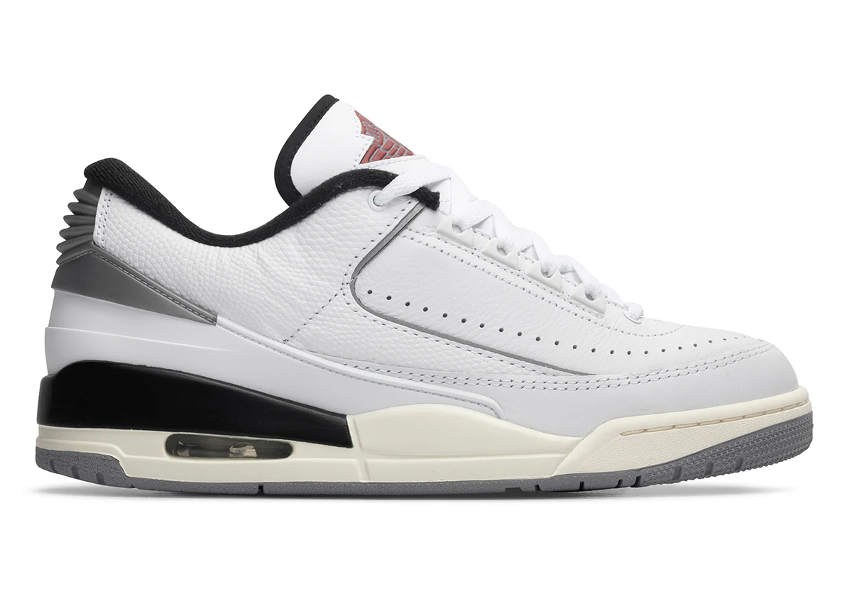 The “White Cement” AJ4 gets a shoutout due to recency bias, but the upcoming Jordan 2/3 is best compared to the original Jordan 3 colorway of the same name. The hybrid model’s Jordan 3 sole comes with black paint across the heel and “Cement Grey” tread underfoot, aptly taking after the 1988-born Tinker Hatfield classic (aside from “Sail” as opposed to white on the rest of the midsole). The low-top Jordan 2 upper keeps things consistent with white leather paneling, “Cement Grey” touches on the quarter and heel, and a “Fire Red” Wings logo over the tongue.
