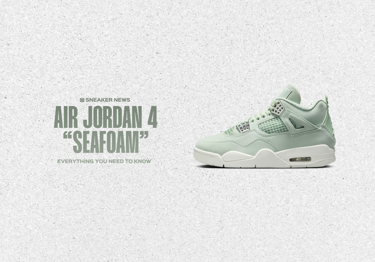 A cleaned-up look in the vein of 2024’s “Metallic Gold” or 2023’s “Blank Canvas,” the shoe delivers a heavy dose of the titular “Seafoam” through the upper, only interrupting it with metallic eyelets and branding notes and a pure white midsole underfoot. As seen on those aforementioned pairs, this is the brand’s favored strategy for women’s Jordan 4’s: relying on simplified aesthetics and some elevated touches in the margins.