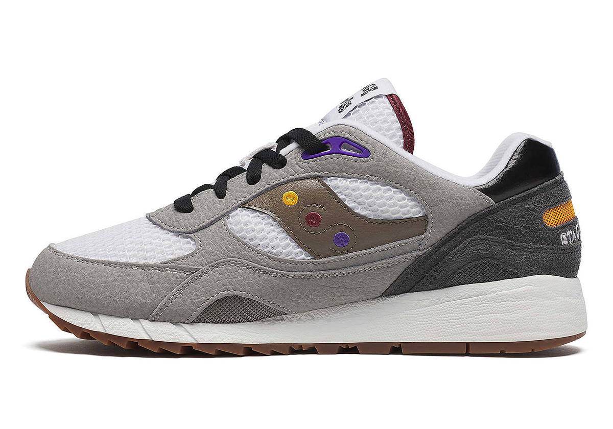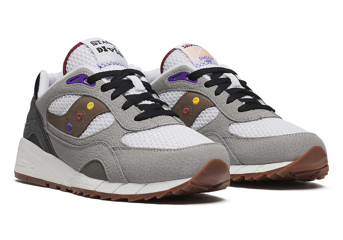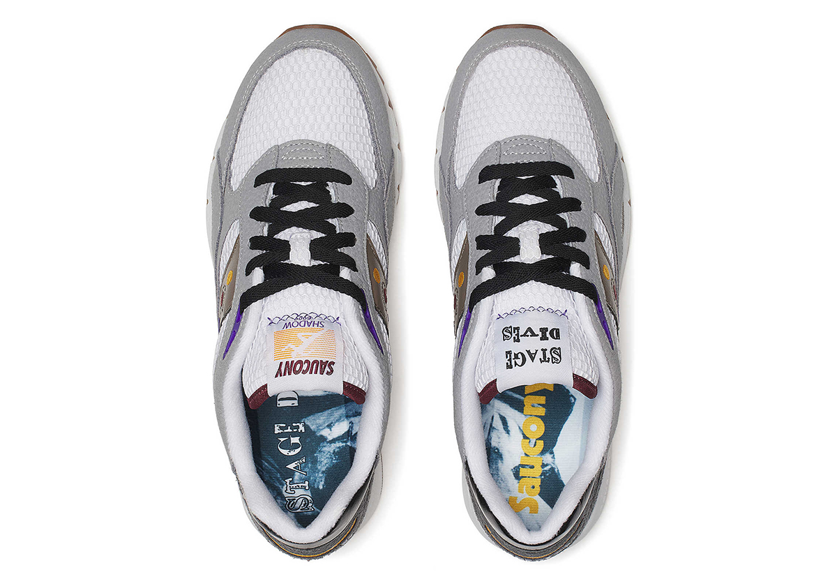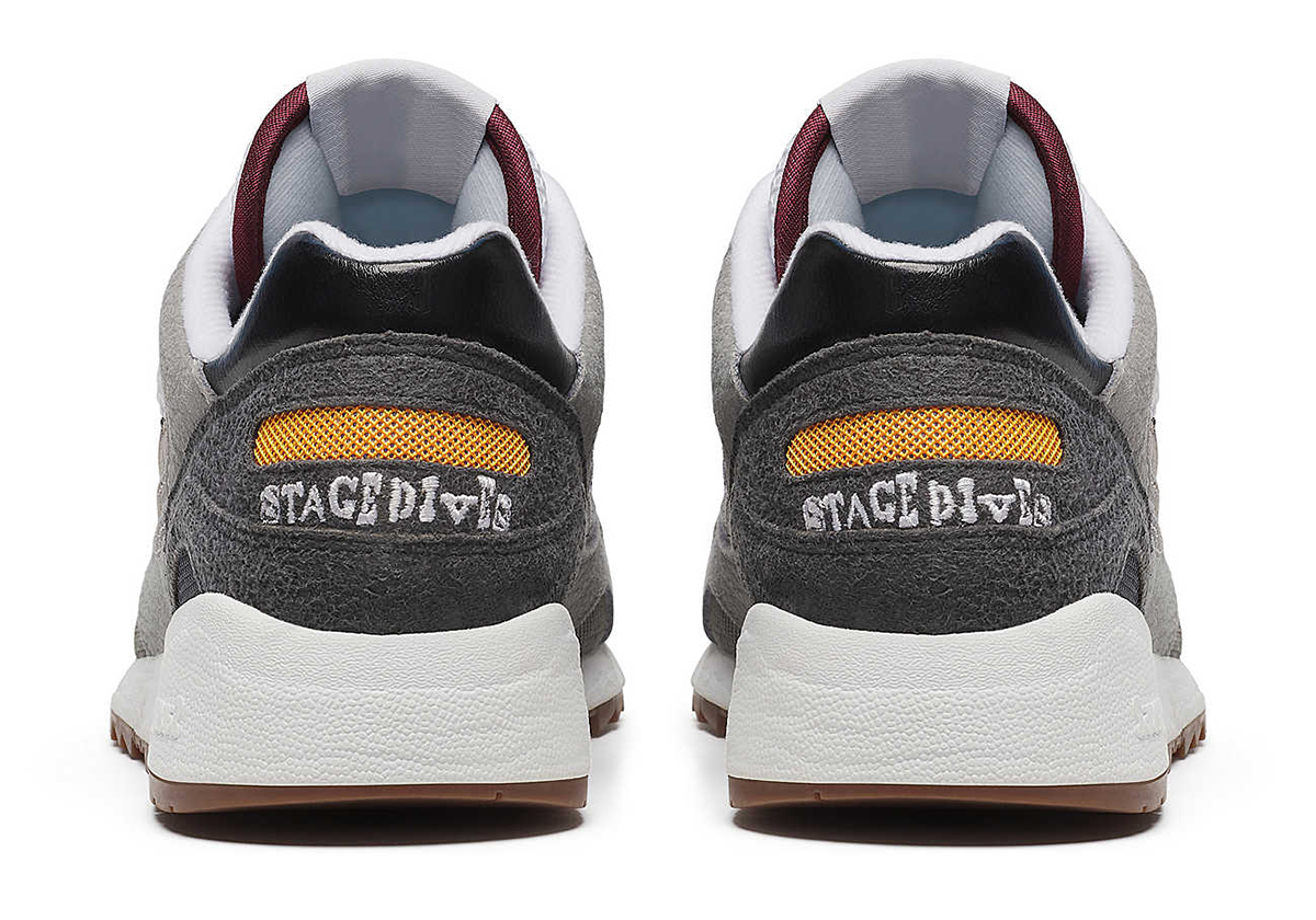 The Saucony Shadow 6000 is the canvas, and Imhoff’s deep connection to the hardcore-punk scene is the inspiration. The defining quality is stitched text reading “Stage Dives” on the heel, taken in multiple different typefaces for an edgy ransom note effect. More “Stage Dives” text appears on custom insoles as well as the left tongue tag, while the heart of the sneaker is comprised of white mesh, grey suede, and three different types of vegan leather; mainly pebbled grey. Yellow, red, and purple accents round out the highlights up top, complemented by a white midsole and brown gum tread underfoot.