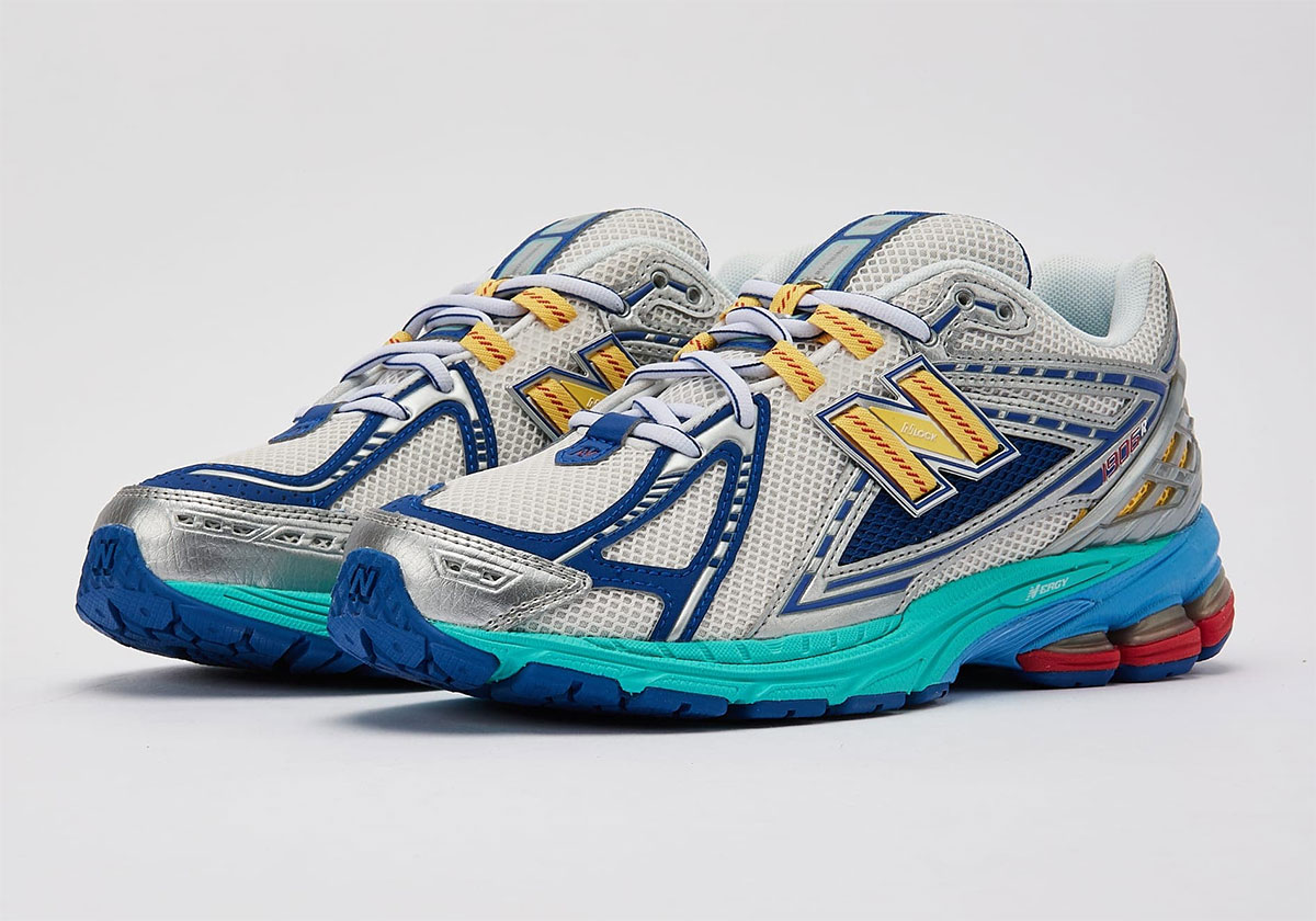Aiming to evoke the surface of the moon, the design begins with a light grey base and metallic silver overlays. Fire signs are represented by red and yellow accents, while water and air signs show up through an oceanic mix of blue tones. The N-lock logos appear in yellow with red stitching, paving a transition into red accents on the heel cushioning underfoot. Vibrant cyan takes up most of the real estate across the midsole, while a darker, royal shade settles on the overlays and outsole.