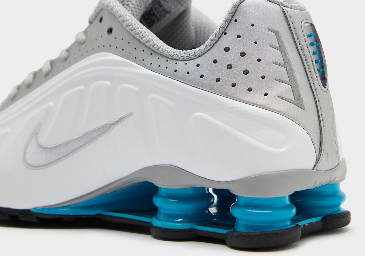 Official images reveal white leather sidewalls and “Metallic Silver/Flat Silver” across the top portion; pretty standard fare for the model. As we’ve seen time and time again, the titular accent shade makes small yet impactful appearances on the Shox cushioning pillars, tongue logo, and heel.