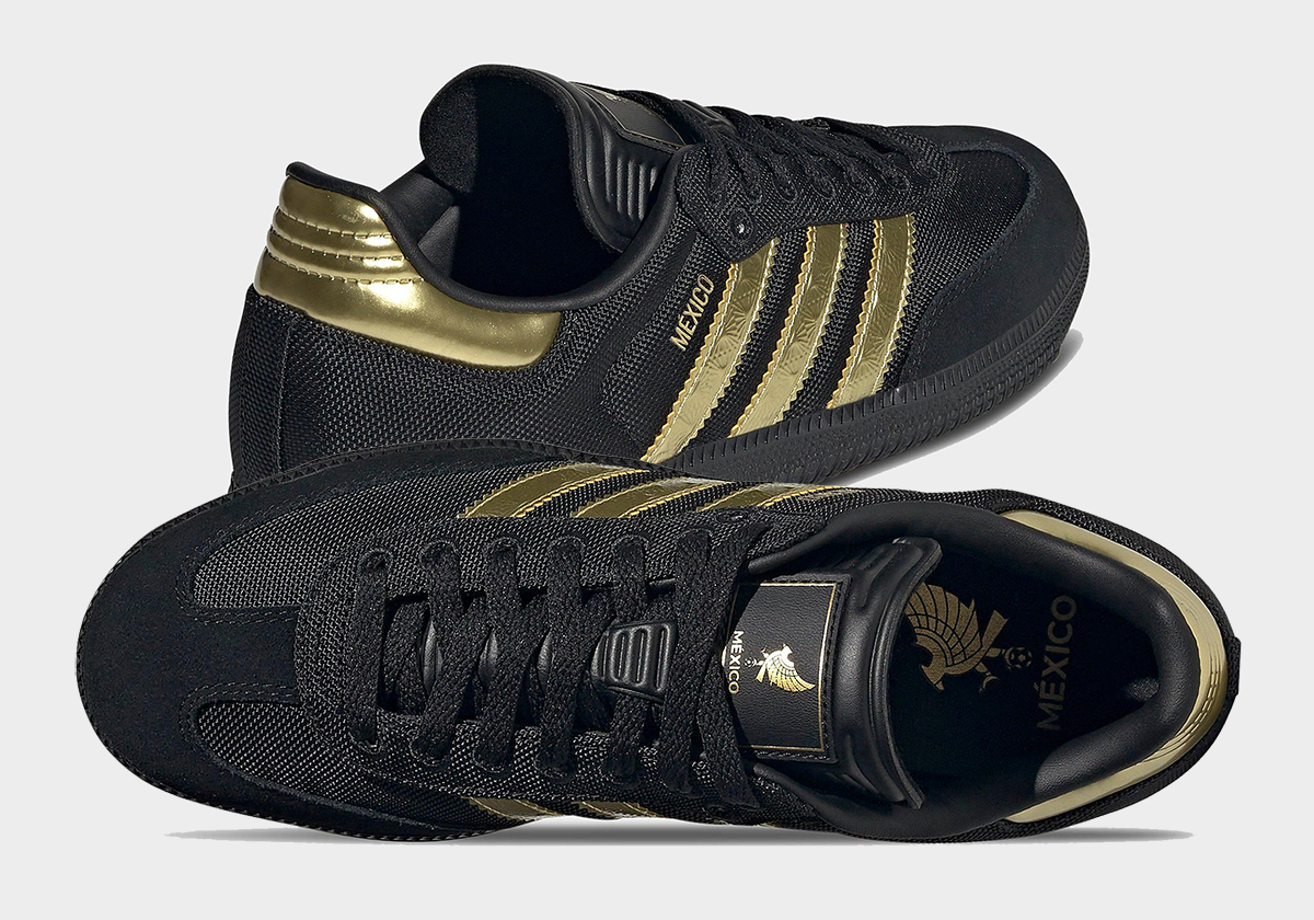 Already, the adidas Samba “Mexico” is confirmed to “belong to an exclusive range by adidas, [including] a striking match kit.” If you’re reading the tea leaves and early info on that front, the Mexican jerseys for CONCACAF are almost assuredly the inspiration. On top of the paired gold-on-black colorway, the tiled patterning shining through on embossed print atop the Three Stripes branding matches the dominant theme from these upcoming jerseys. Some final notes of intrigue rest with the golden eagle, perched on the tongue and the sock-liner, and the mesh foundation that this “Mexico” Samba utilizes, swapping into more breathable fare given its on-court intentions.