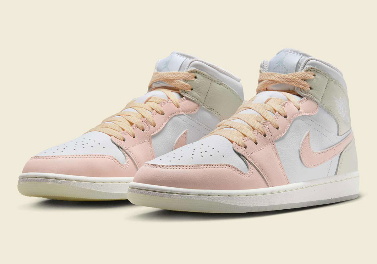 The latest Easter-esque shoe to surface is this Air Jordan 1 Mid for women, decked out in “Sea Glass” and “Guava Ice” leather overlays. Standard white leather makes up the base layer, including the collar section, while the Jumpman logos on the tongue and insoles deliver splashes of light Glacier blue. Underfoot, a semi-clear Sail outsole rounds out the design.