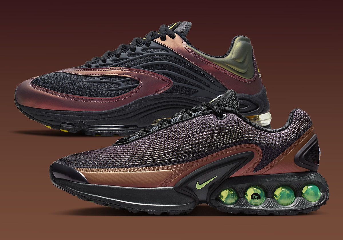As borrowed by British-Nigerian artist Skepta on his Air Max 97 from 2017, the original Air Tuned Max “Celery” colorway consists of bronze and green iridescent treatments atop a black base. The Air Max Dn does its best impression of the Tuned Air classic here, appearing with a brown upper, bronze mudguard, and lively splashes of neon green within the Dynamic Air chambers. The rest of the build completes a “Celery” theme in black, amplified by retro-inspired Nike logos on the insoles.