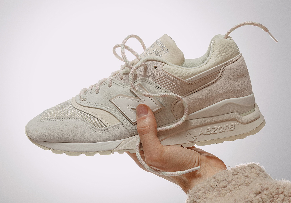 This marks a return to a KITH and overall collaborative favorite of the 2010s, with the brand’s loud “Cyclades” edition from 2015 coming on the hybrid model and founder Ronnie Fieg often citing makeups of the 997 proper as among his most cherished. In contrast to that shoe from a decade ago, the “White/Marshmallow/Angora” and “White/Ice Blue/Peach” pairs on tap execute the tonal look that KITH has leaned into with their modern output, the latter truly hitting the “Easter” nail on the head with extremely subtle pastels cropping up throughout the profile. On that opposing edition, the material quality of the shoe instead takes the spotlight, highlighted by tumbled leather across the collar and under the eye-stay, a pocked mesh toe, and suede overlays carrying the overlays.
