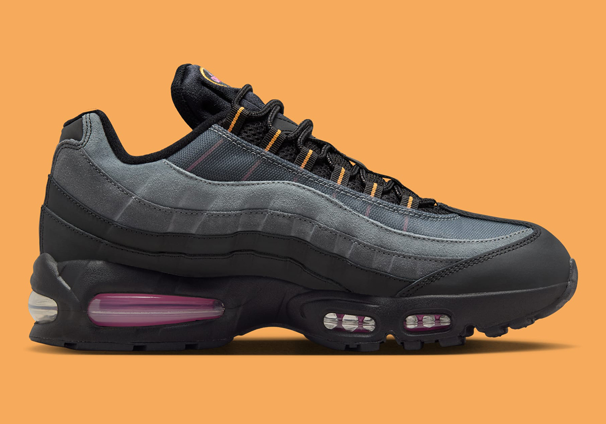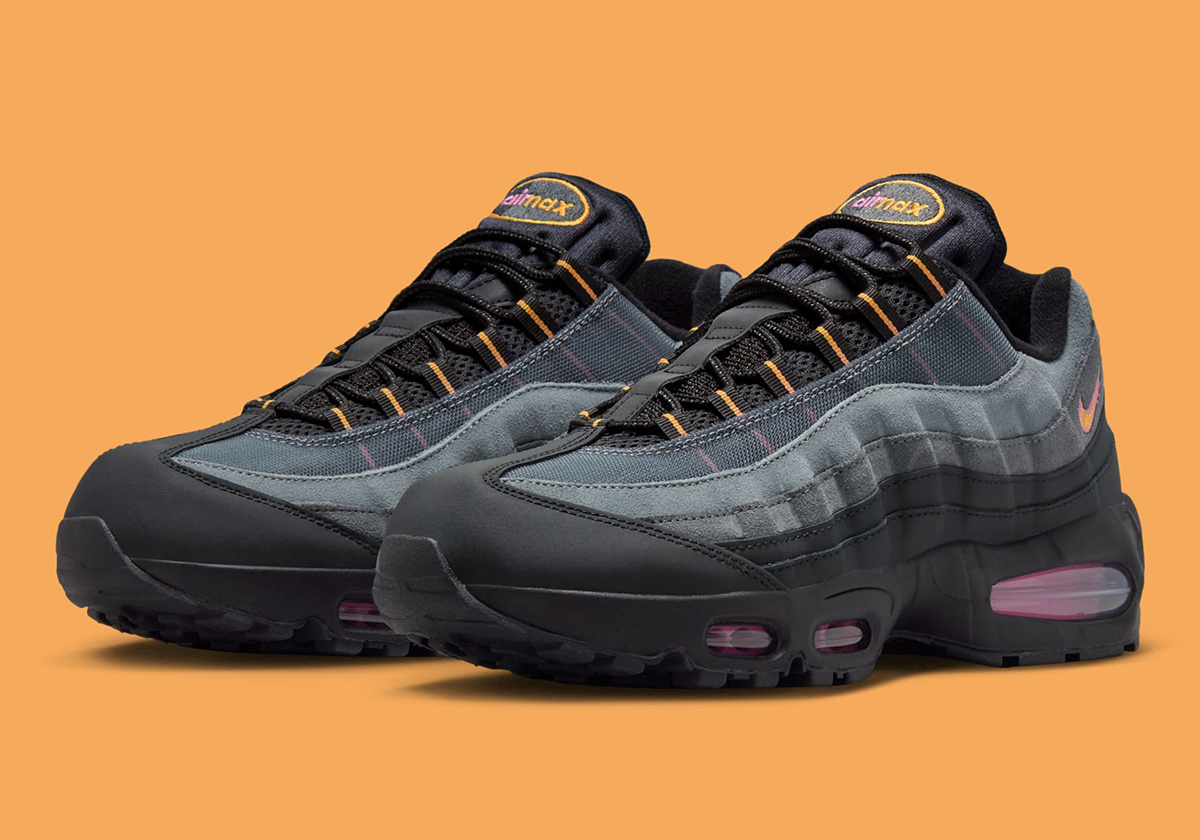 Official retailer images reveal grey suede and black leather sidewalls, the latter of which tie in with the midsole. The “Sundial” orange shade appears on the eyelets, while “Playful Pink” makes its most notable appearance within the big bubble Air units. Importantly, while not shown in this image set, the sneaker features colorful “110s” text on the insoles. The Air Max 95 used to cost £110 in the UK back in the day, hence the nickname.