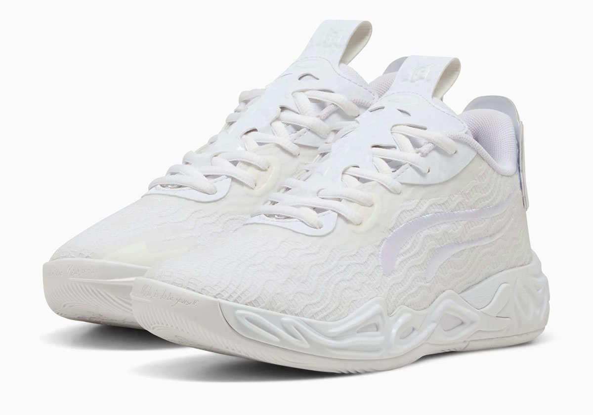 If he chooses to take advantage of outdoor ball season, or if you plan on following in his footsteps, PUMA has you in mind with the MB.04 Lo “Ice White,” an easily digestible, “Triple White” style make-over for the update to his signature shoe. In case you missed the article where Sneaker News broke news of the PUMA MB.04 Lo, you’ll notice some hardware changes on top of the obvious switch in height. To befit this shorter life, the TPU cages essentially blend into the mesh foundation, while the Phoenix badge goes from the tongue to a physical emblem on the heel. All of these new design features get a ghostly white overhaul save for that engineered mesh base layer and the laces, allowing the glossier, brighter sections atop them to stand out all the more.
