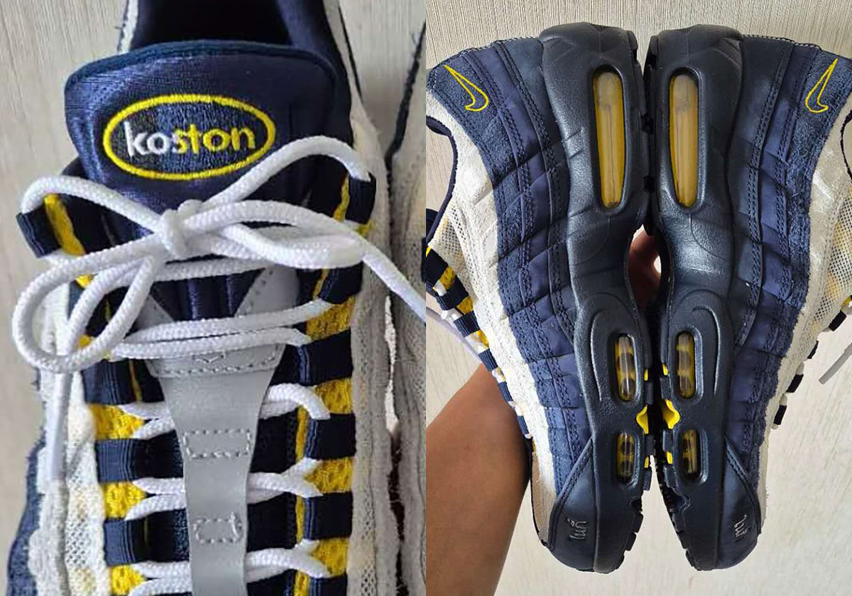 The sneaker’s navy blue + yellow combination conjures memories of “Michigan” Air Max colorways, but the more likely reference is California’s official state color palette (and/or the San Bernardino city flag). The sidewalls go from hairy suede up top to nubuck down below, incorporating a subtle light-to-dark blue gradient across the bottom three layers. The yellow accent color appears most notably within the Air units, making additional cameos on the outsole and mesh upper portion. As for the branded touches, Koston’s last name cleverly appears in the Air Max 95 font on the right tongue. Thai text reading “Nike” on the lateral side of the right toe honors Koston’s roots, while the Nike SB logo appears in yellow on the spine.