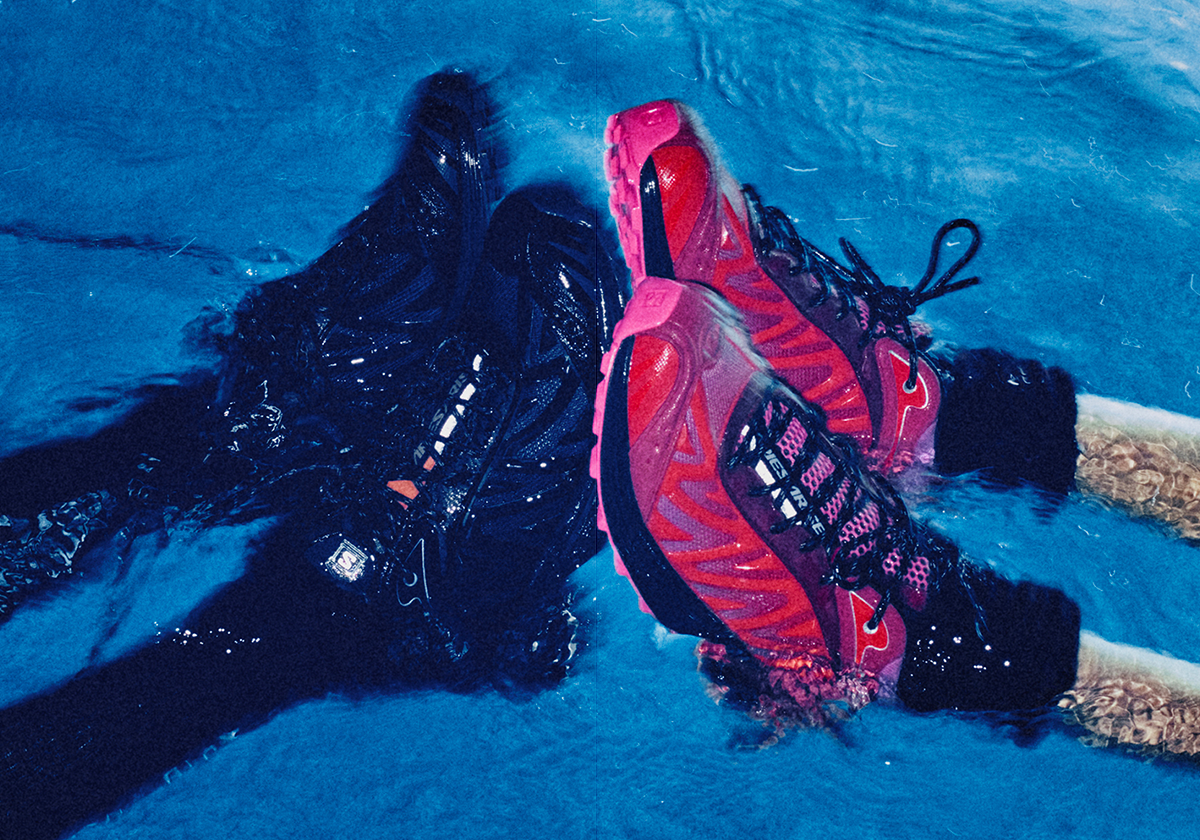 You’ll spot that immediately with the TPU overhaul of the quarter panel, given 3D texture in contrast to its usual thin synthetic layout. It’s also a clever bit of branding for the Italian label, working their “A” monogram into the design. Towards the rear, another novel tie comes with the co-branded hit at the collar, pinning the Salomon brand name within broken Roman columns, another hallmark of the Aries ecosystem. Two colorway options have been revealed here, one embracing a romantic blend of pink and red that culminates in a rosy gradient within the sidewalls, and an all-black counterpart, breaking up its nocturnal profile with a flash of tan underneath the heel.