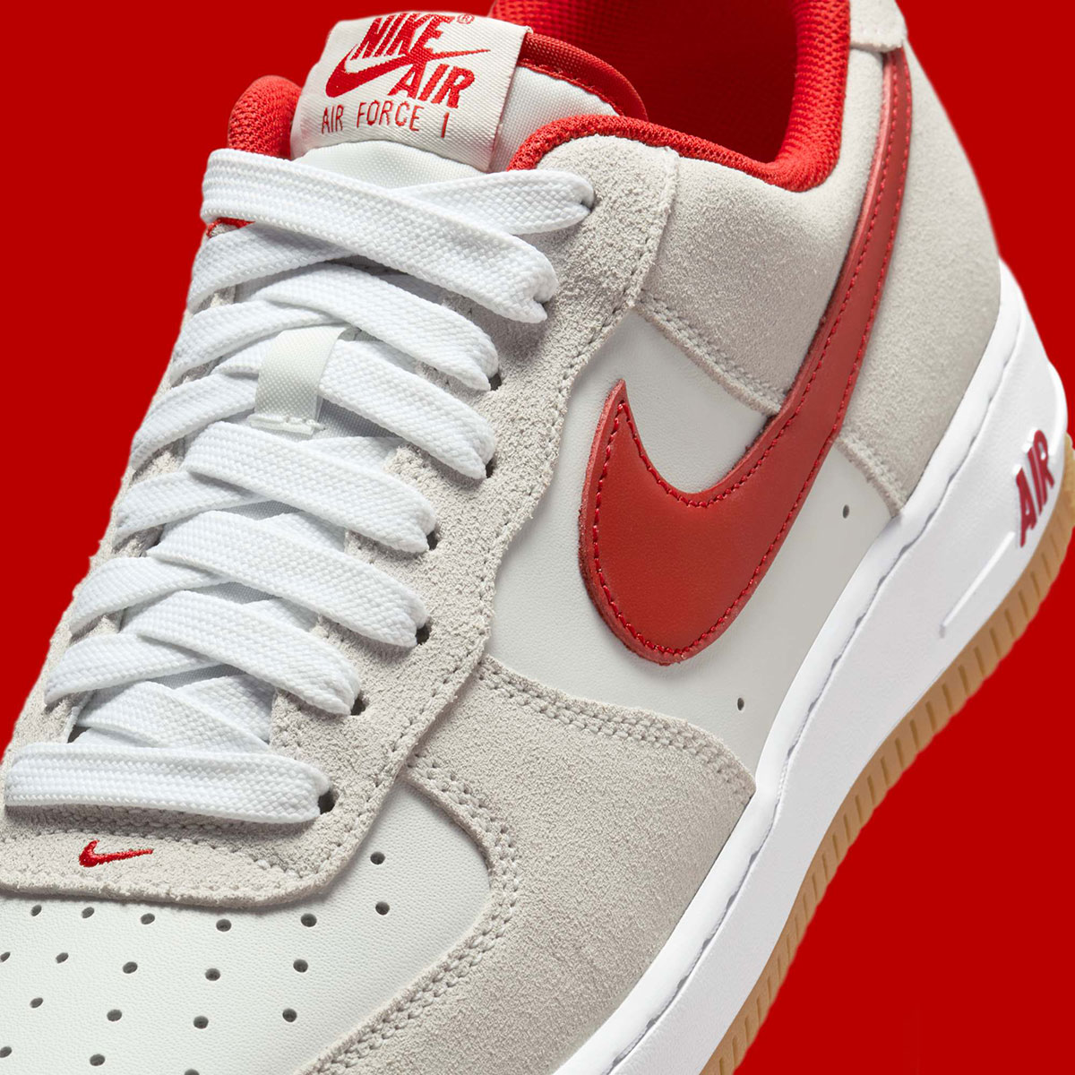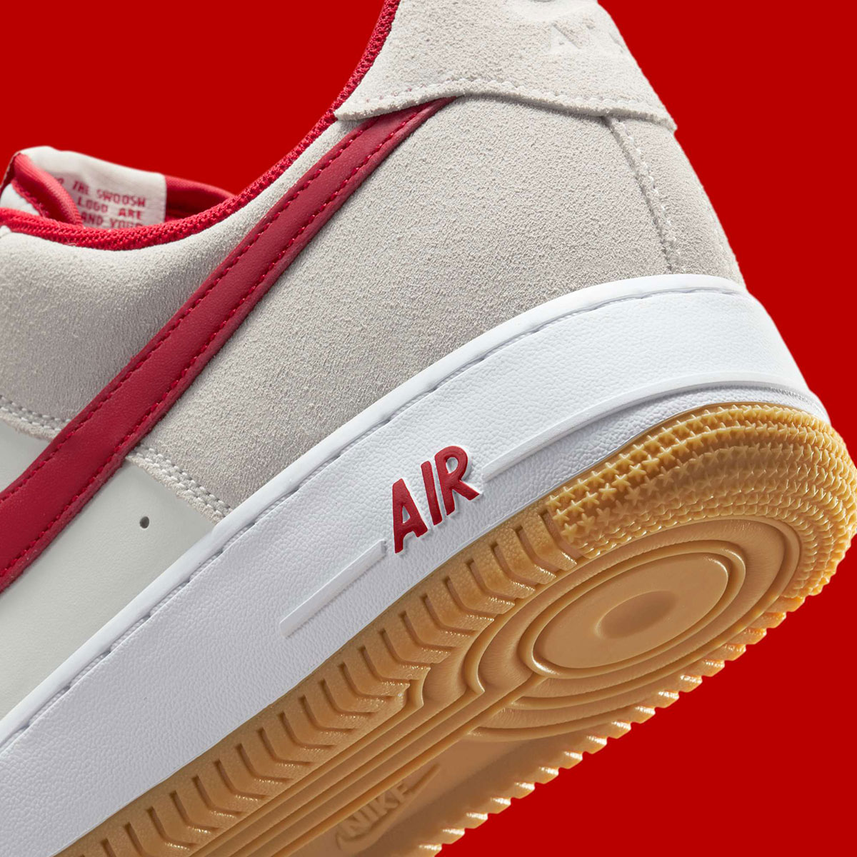 There’s nothing too revolutionary about this pair. A mixed media treatment of off-white, delivered with leather underlays and suede overlays, gets some more energetic counterpaly with the “Varsity Red” Swoosh and mesh sock-liner. To close, as alluded to in our title, the ever-dependable gum sole formula anchors this design at the very bottom.