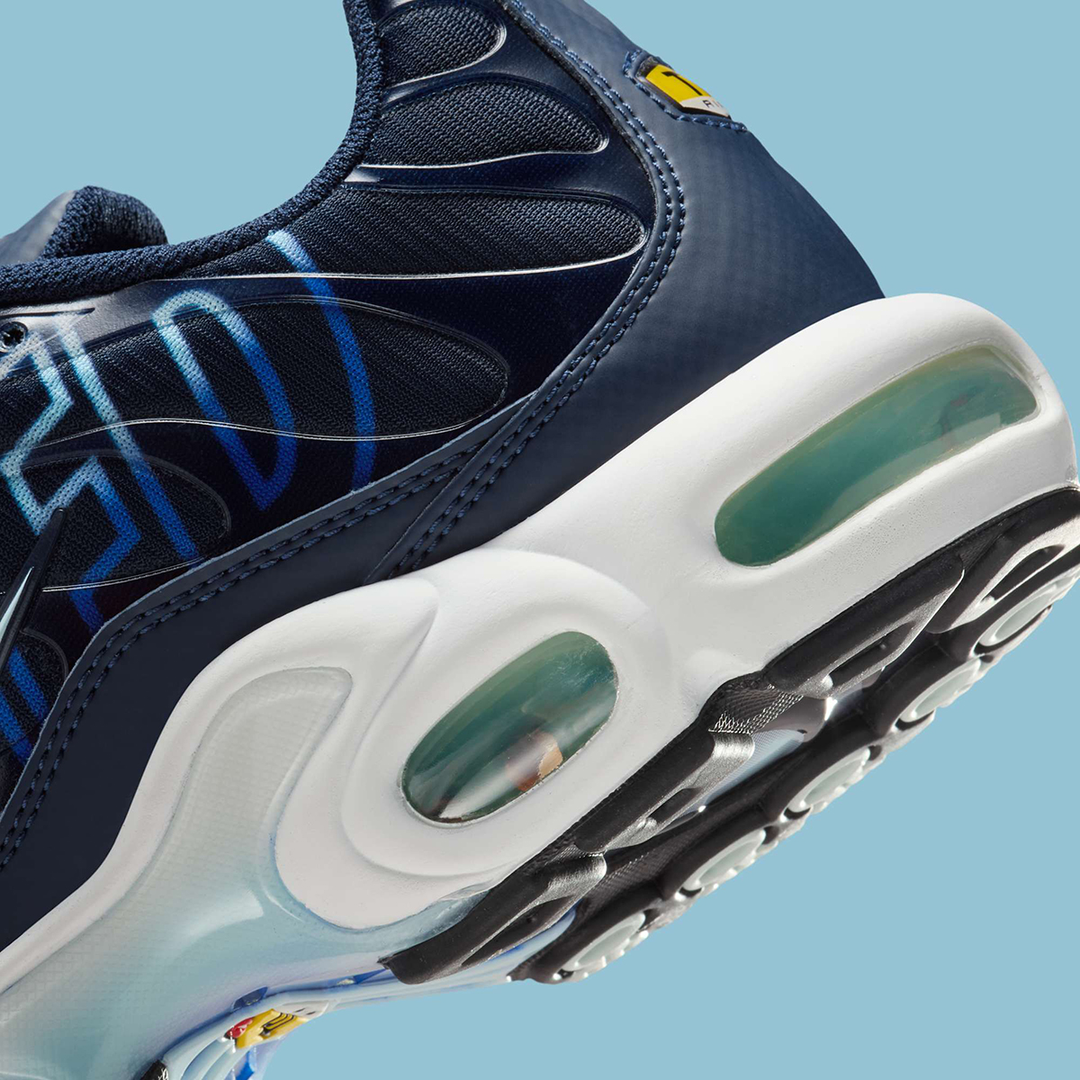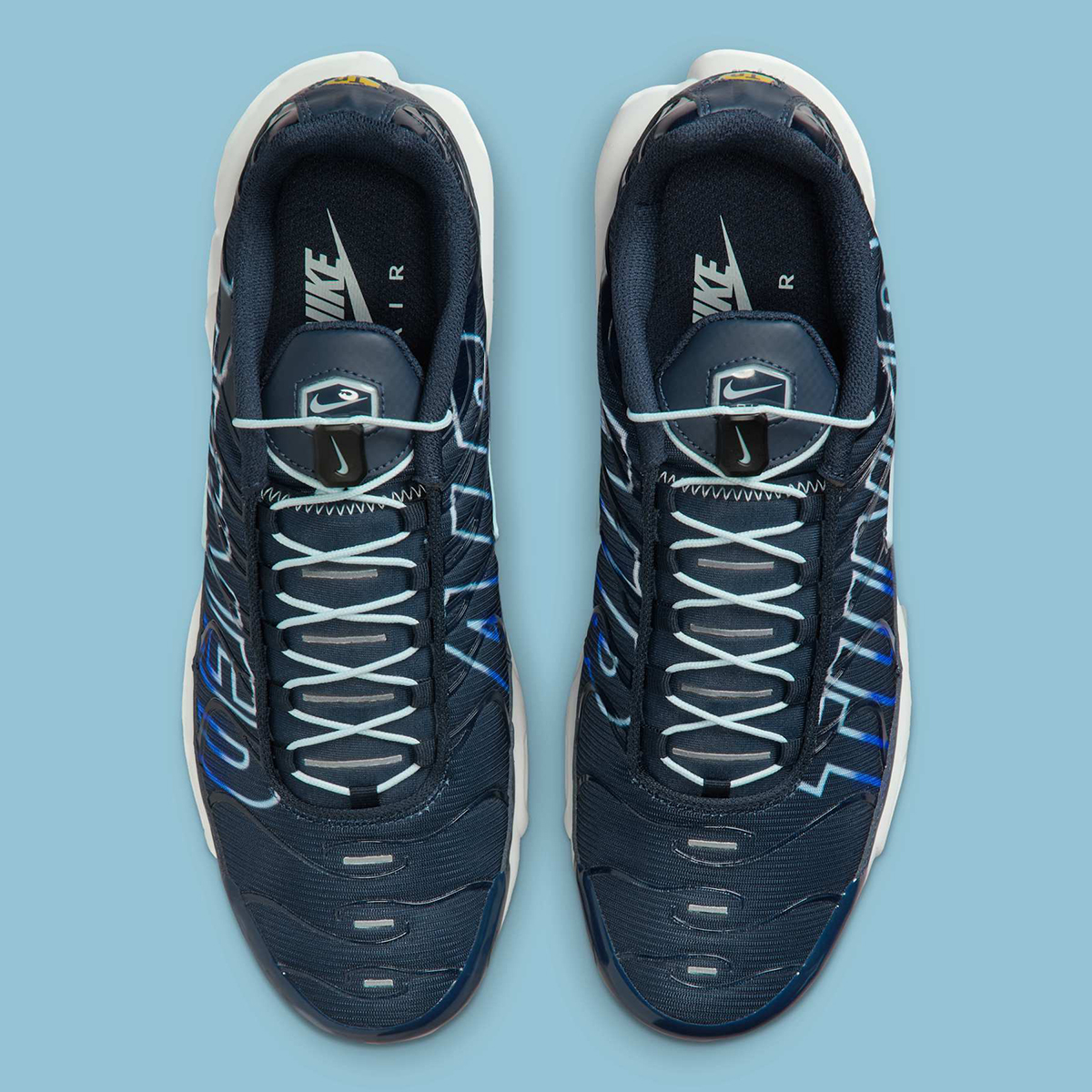 While the Air Max 95 is focused on big bubbles, the Air Max Plus is focused on big branding. We’ve spilled ink on several upcoming colorways featuring outlined “Tuned Air” text in recent weeks, and now we have another to report. This “Obsidian/Comet Blue/Glacier Blue” do-up is the latest of its kind to hit the ‘net, shown here via official images.