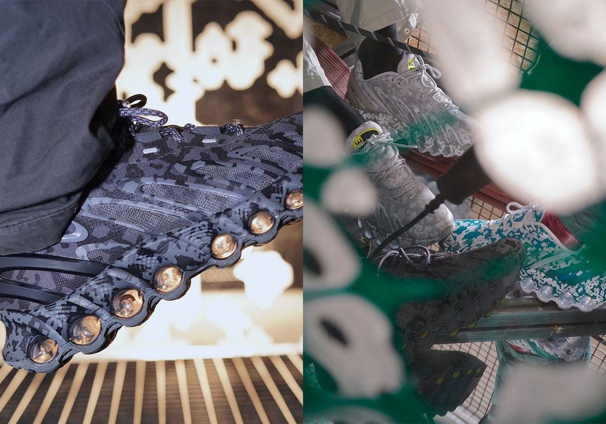 Teased in lookbook images a la a Supreme collaboration, the Cav Empt x Nike Air Max DN8 harkens back to the companies’ first join-up effort, borrowing the abstract, digi camo print that fans first took in for their two-headed Air Max 95 capsule. The fashion label one ups that previous work, tacking a third edition onto its 2025 counterpart. That manifests with two neutral, monochromatic editions in black and grey, on which the pattern sinks into the overall profile. The third is where the collection really makes a strong first impression, harkening to ’90s vibrant tonality in a white/aqua/purple split.