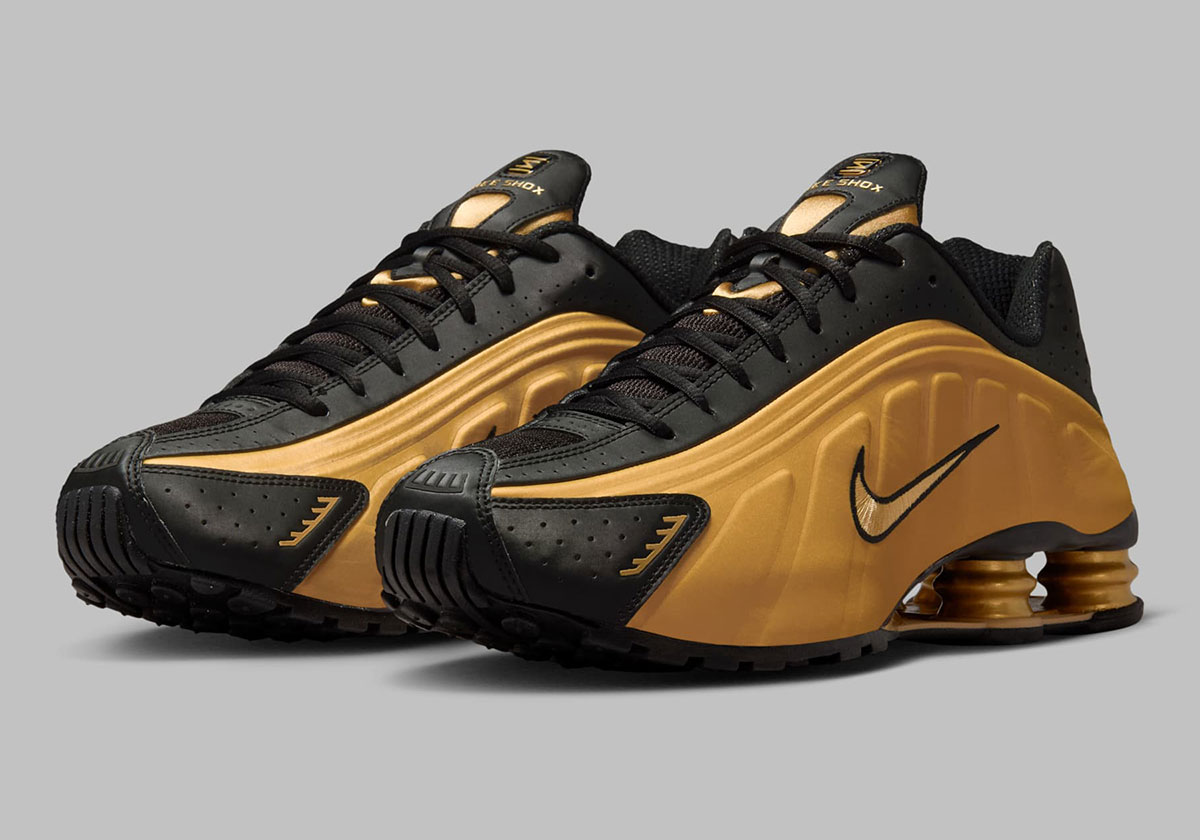 Capitalizing on a sleek two-tone split, the Nike Shox R4 keeps black interiors, toe-caps, and outsoles, wedging “Metallic Gold” accents in the space throughout, including with embroided Swooshes, the rear Shox units, and the wavy sidewalls. This pair slides into what’s becoming a long lineage of golden Shox R4 releases. To whit, in our coverage of the most recent, we noted that it was, in essence, the slightest twist on one of the most-coveted secondary market propositions in the silhouette’s original retro run. With that in mind, issuing further spins on an already well-received pair is a prudent play on Nike’s part, likely to pay off again even with the changes to the heel Shox unit.