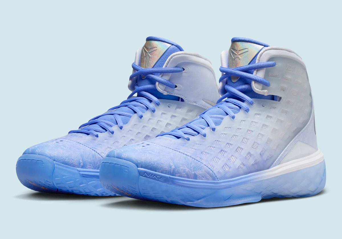Originally leaked back in February of this year, the tangible product far surpasses the simplistic fare that we expected via mock-up images. Surfacing well in advance of its expected Holiday release, the shoe places standard Christmas red and green off to the side, instead embracing more of a “Winter Wonderland” concept. The exterior diamond-shaped TPU cage goes translucent, shifting from pure blue towards the toe. Even with that design choice and additional showstoppers like a silver reflective badge on the tongue, the toe may still be the centerpiece, utilizing the Sheath logo to evoke crackling ice surfaces.
