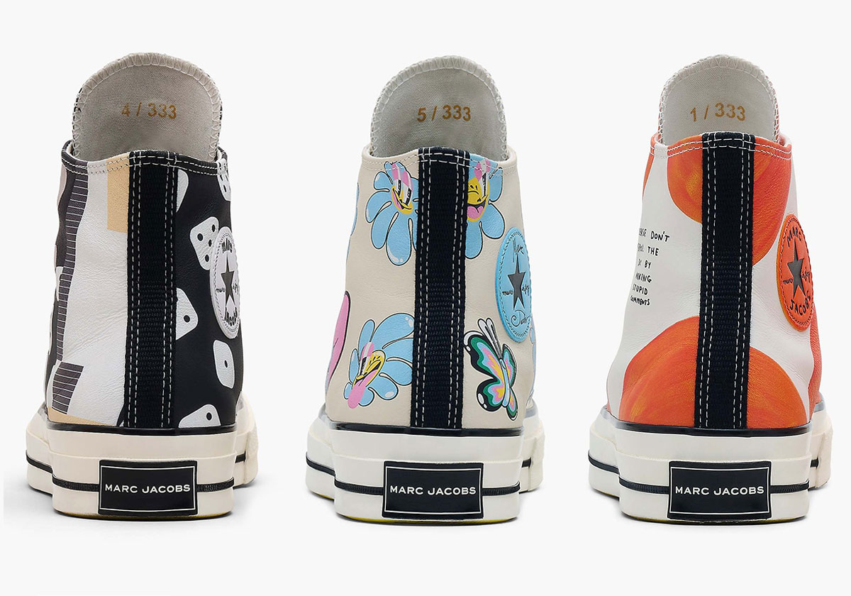 Check for your size in the black/white Derrick Adams, cream/blue/pink Hattie Stewart, and orange/white David Shrigley colorways using the attached links. While it would seem these particular versions of the Marc Jacobs x Converse Chuck 70 are exclusive to MarcJacobs.com, select retailers have started listing canvas versions with slight tweaks to the patterning. Catch images of those included below.