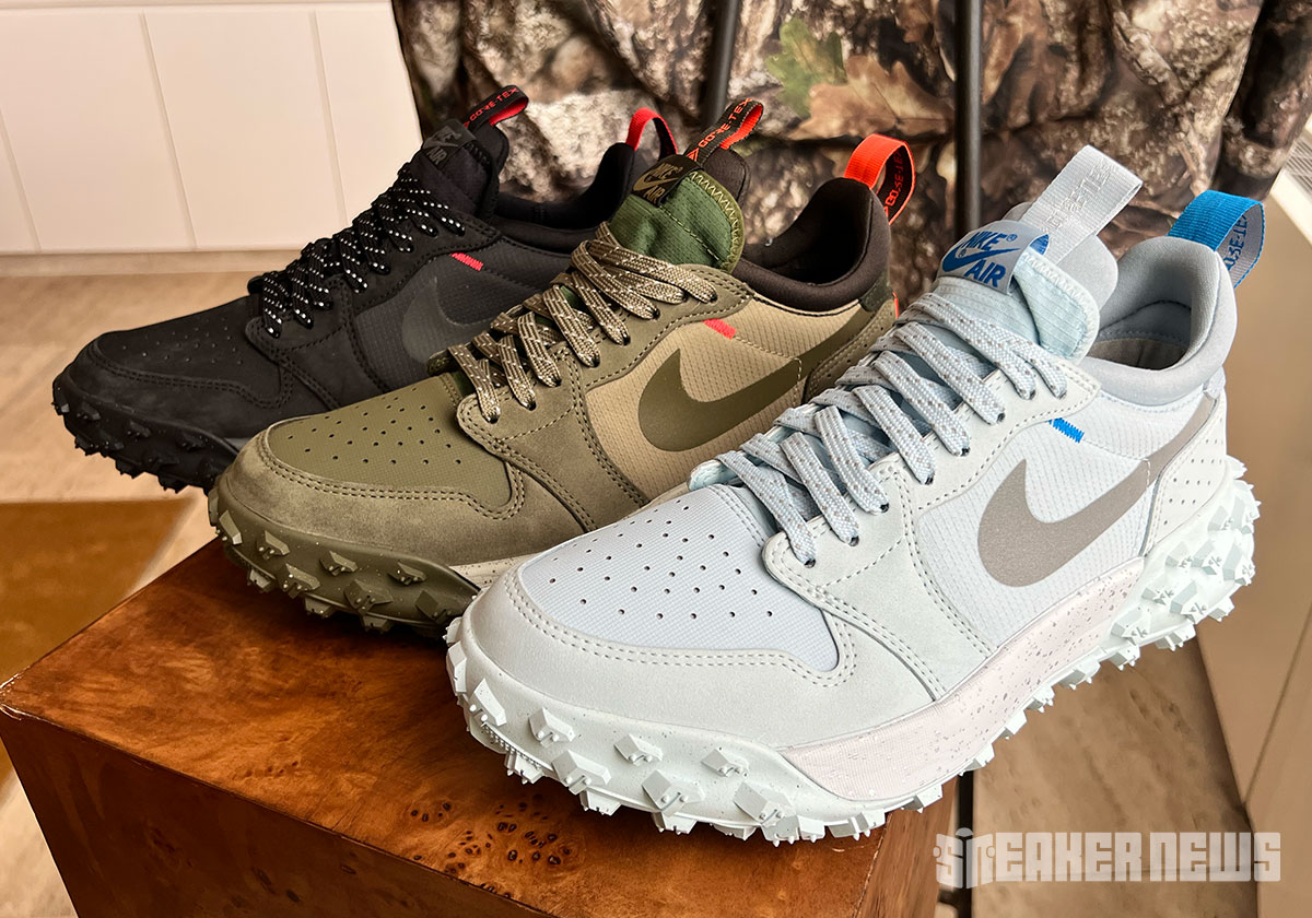 Previewed at a private event in New York City, the Air Jordan 1 Low Element captures the DNA of Peter Moore’s design, but enhanced by a studded outsole for grippy traction and Gore-Tex protection against the elements. The interior bootie is blanketed by a standard Air Jordan 1 tongue in a gridded nylon that covers the toe-box as well as the mid-foot. The overlays are a soft suede with micro perforations at the heel, while the taped Swoosh logo sits in its standard position.