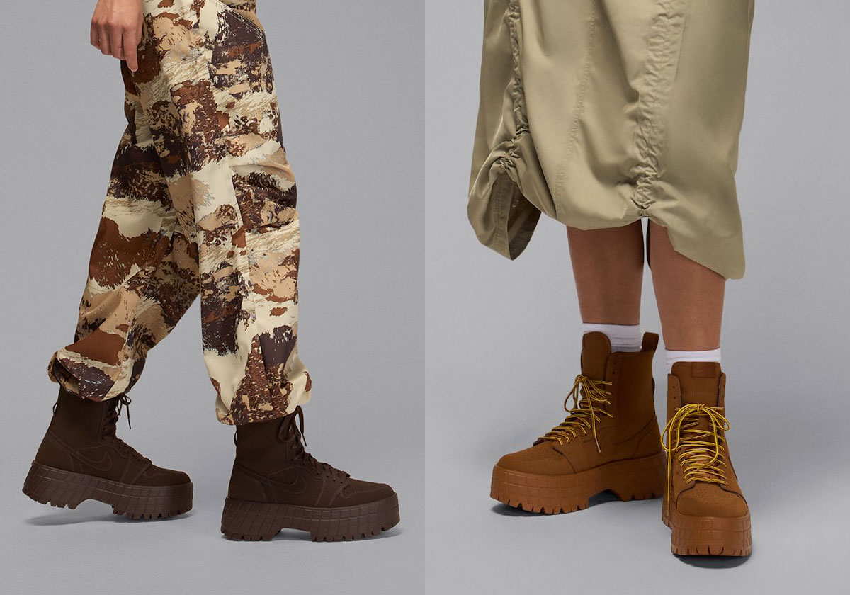 Though that silhouette is the most eyebrow-raising design we’ve caught this season, Nike has a long history of homage (or imitation, if you take a more cynical viewpoint) to a particular lane of Fall/Winter wear. The “Wheat” tonality that Timberland has long majored in has already spread onto shoes like the Air Force 1, but as it dawns on the Air Jordan 1 High Brooklyn, the resemblance is truly uncanny.