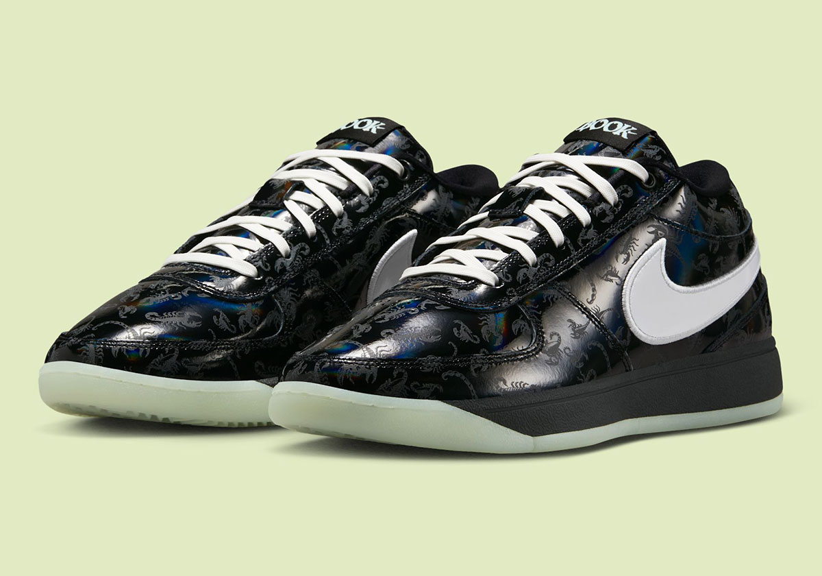 Depicted in retailer shots and a social media in-hand look, the Nike Book 1 “Halloween” opts for a glossy leather in this year’s take, coated in an all-over scorpion print that alludes to Booker’s late October birthday and resulting Scorpio sign. While that and an overall black/white colorway, aligning with the Nike KD 18 “Halloween,” makes for a sensible celebratory pair, the true draw just might be the lenticular/rainbow finish, somehow allowing for this monochromatic edition to become one of the more eye-catching in Book’s canon. For one final piece of intrigue, the man himself stopped into that aforementioned IG unboxing to note that there’s some finer detailers at play when viewed under a blacklight.