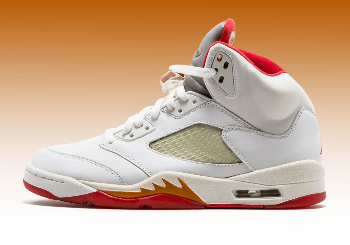 No images of the 2026 version have surfaced yet, but we have no reason to believe the retro won’t look like the original. The “Sunset” 5s feature a white leather upper, a predominantly white midsole, and a grey tongue. Channeling the AJ5’s most renowned makeup, “Fire Red” accents appear on the interior lining and outsole. The titular “Sunset” orange hue, meanwhile, enters the fray on some of the AJ5’s hallmark features — namely the Jumpman logos, the lace lock, and the shark-tooth graphic on the midsole.