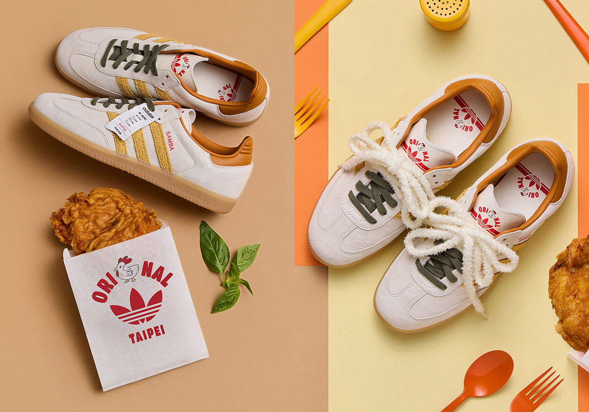 Footwear informed by food fads is hardly a fresh invention — see the litany of Matcha-inspired kicks that have graced our homepage in the past year and change. However, adidas Originals is getting ahead of the curve. Their Taiwanese arm is taking on the country’s XXL fried chicken, nodding to the flattened fare with a do-up of the adidas Samba.