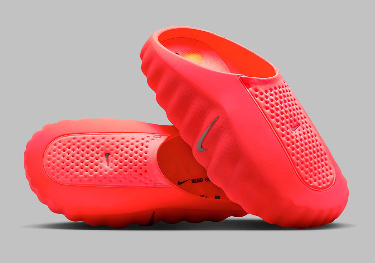 Beaverton has once again elbowed its way to the center of that conversation as the Nike Mind 001 Slide has come to light, building on the one-piece construction that the aforementioned recovery model utilized. There’s no doubt that this silhouette makes good on its industrial, futuristic title, from the pocked patch of fabric that runs down the toe, the perforated ridges on the sidewalls, and the bulging cushioning underfoot. For good measure, this dip into “Solar Red” redoubles that next-gen atmosphere, only interrupted by a vertical chrome Swoosh at the midfoot and “Hyper Crimson” bulbs below.