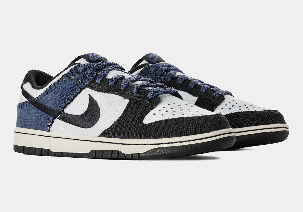 All the key hardware details of the monstrous colorway remain in place, including a suede base, canvas overlays, and exposed stitching around the heel. Embroidered Swoosh logos remain on both sides, the toe box features mini crosses, and shaggy, distressed-looking laces add even more intrigue. This composition gave us “Frankenstein” vibes when paired with a brown/olive colorway, but we’re getting a far less monstrous, more Sashiko-like aesthetic this time around. The heel, laces, and tongue tag come in “Sanded Purple,” while the rest of the sneaker skews toward black and white.